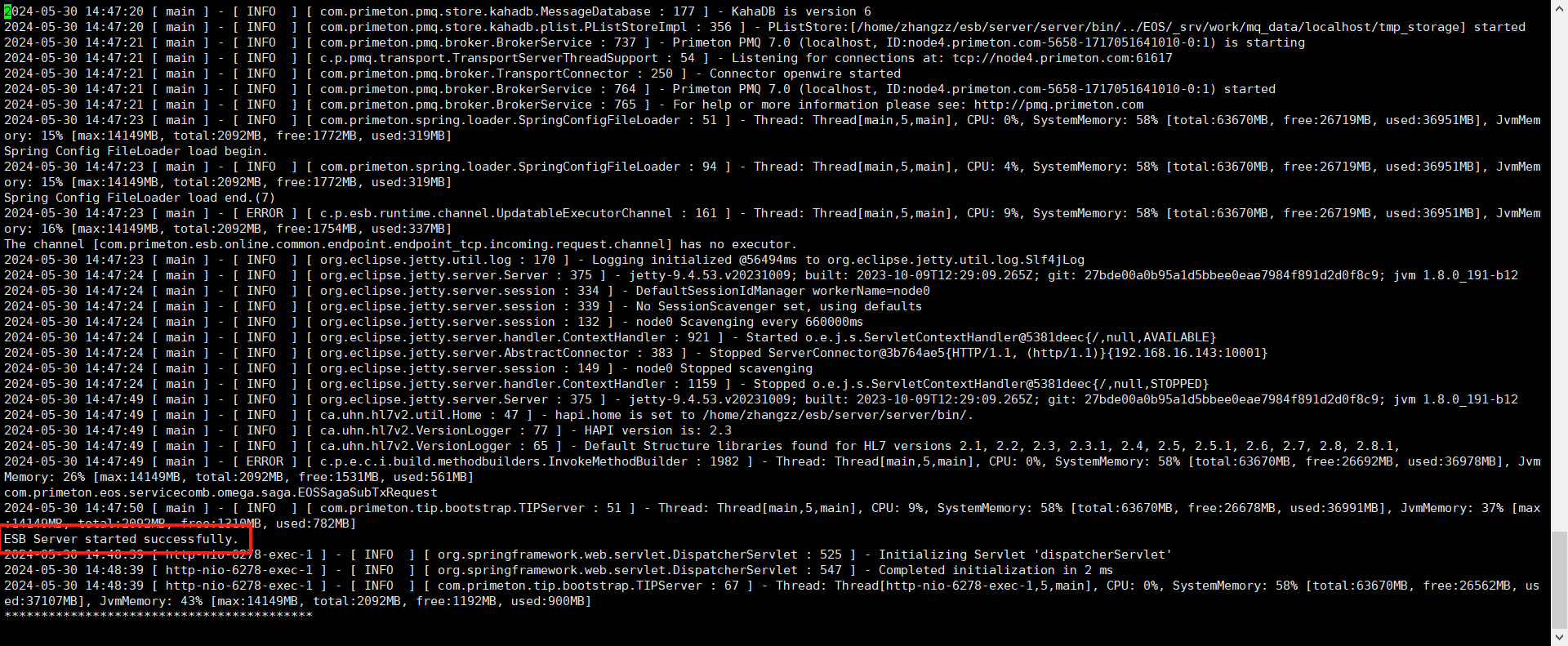 当启动界面出现“ESB Server started successfully ”,表示ESB Server启动成功。