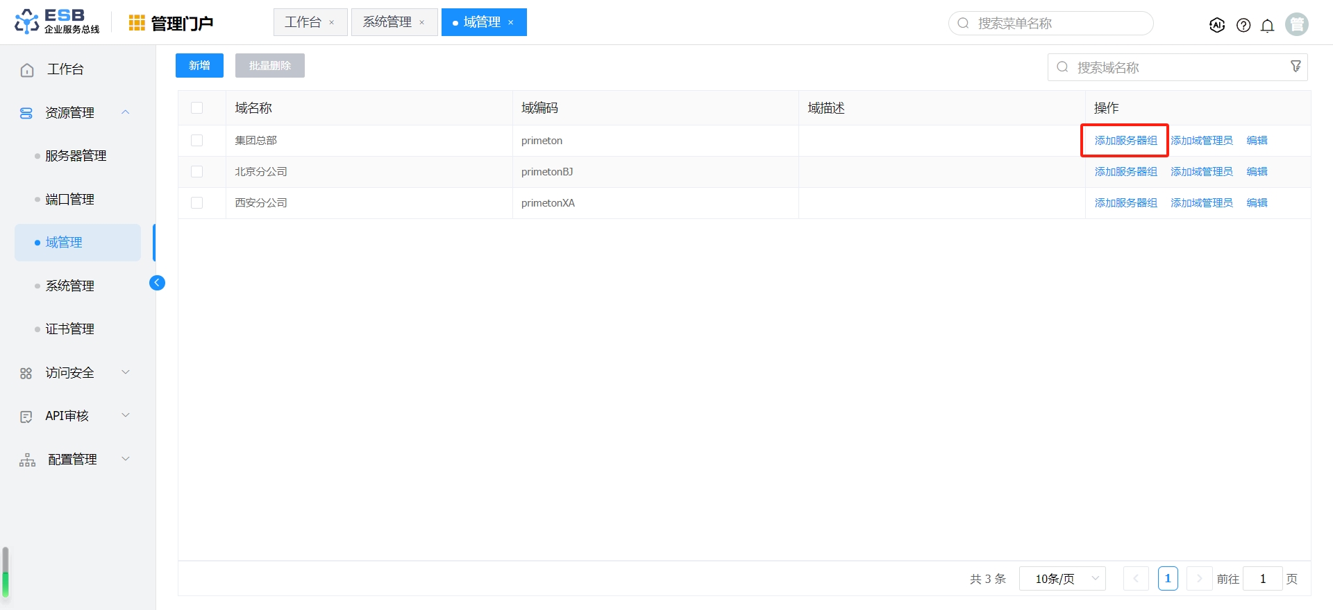 新增域成功后,只有给域分配了可用的服务器组,域下的接口在发布时才能选择服务器,才能进行正常的接口发布操作。在域列表选择已经创建的域,在操作列点击“添加服务器组”按钮,弹出添加服务器组页面。