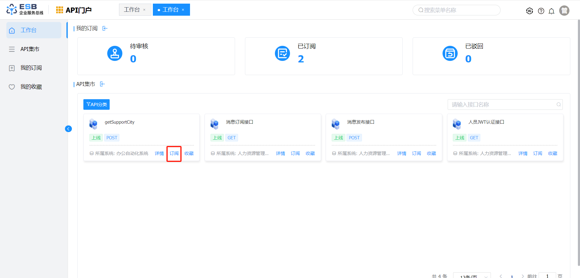 1. 使用manager账号(默认密码:000000)登录系统,点击API门户,进入API门户的“工作台”页面。