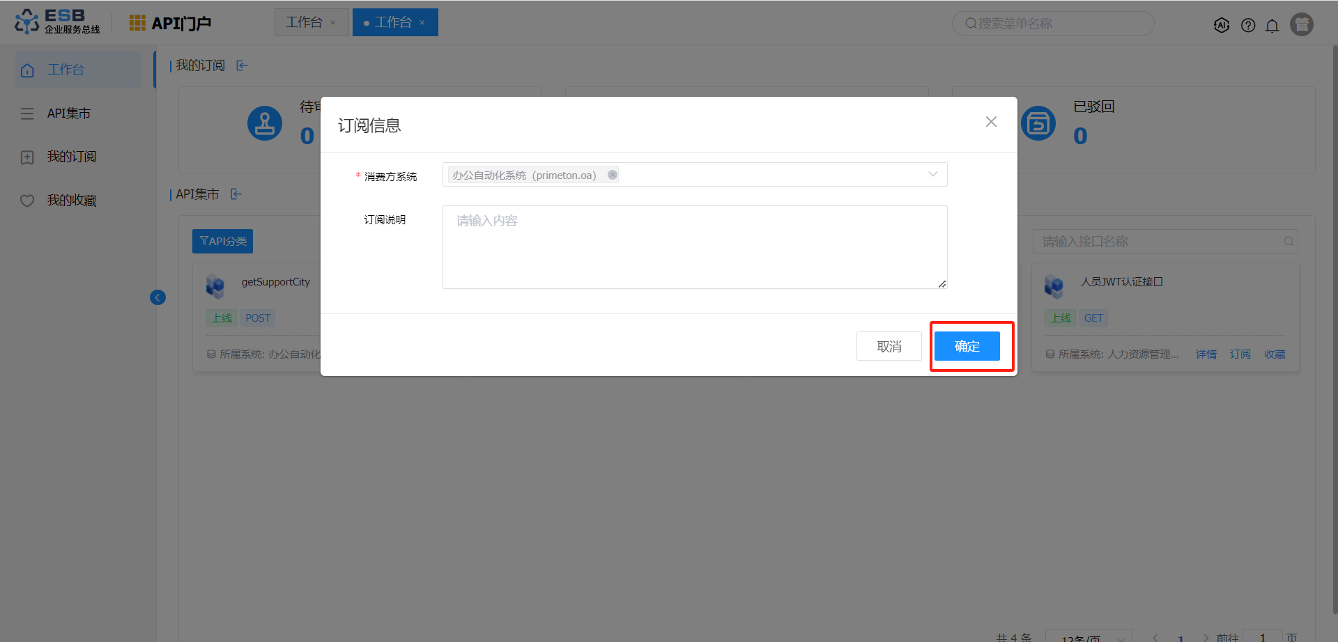 2. 点击工作台页面刚才在”2.2.1.1 API发布”中新增的接口信息卡片下发方的”订阅”按钮,进入到”订阅信息”页面。