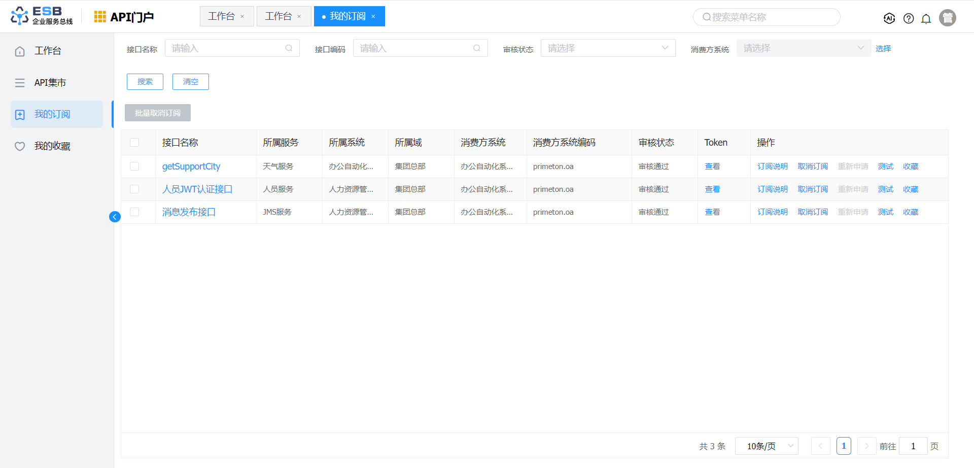 4. 选择”API门户 -> 我的订阅”菜单,进入到”我的订阅”页面。