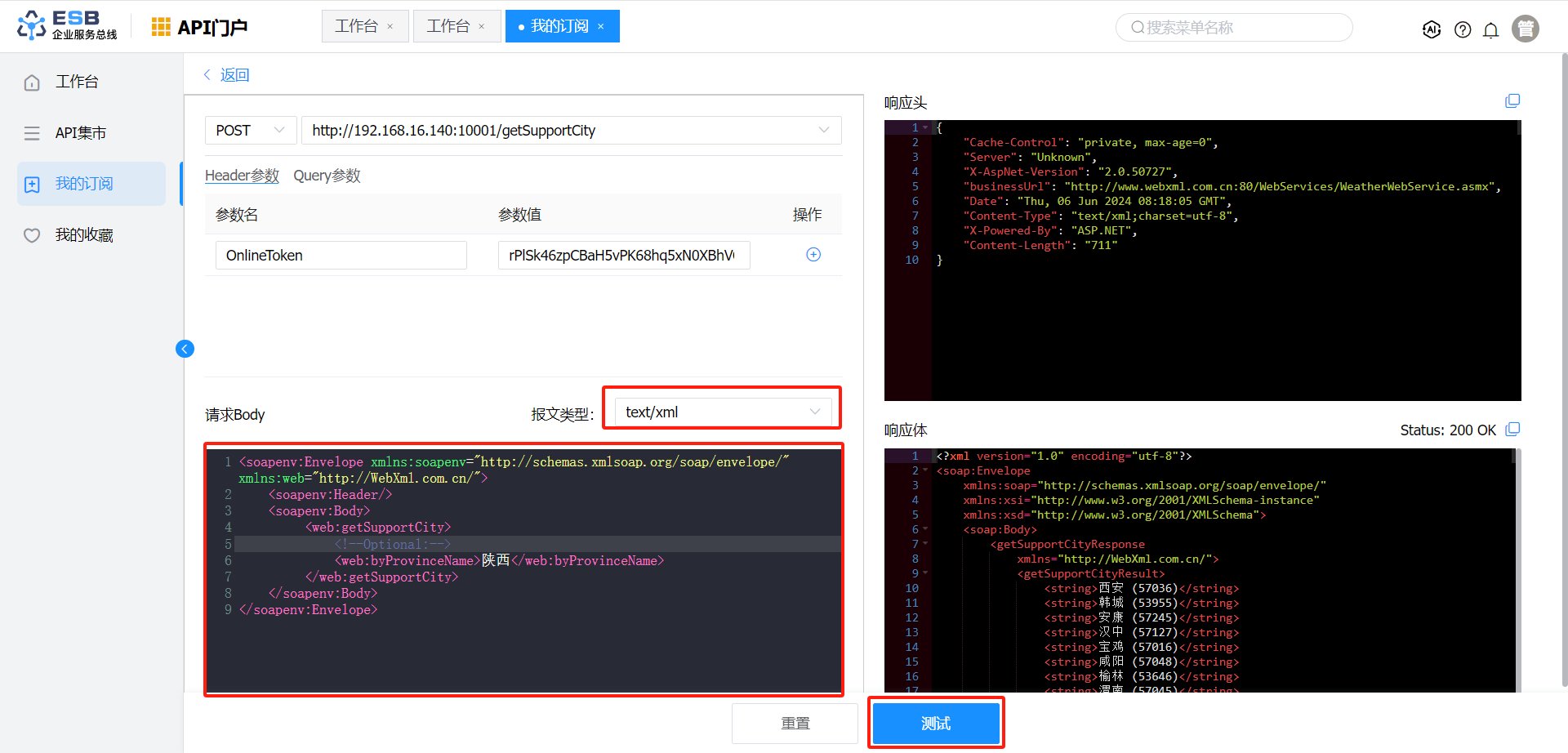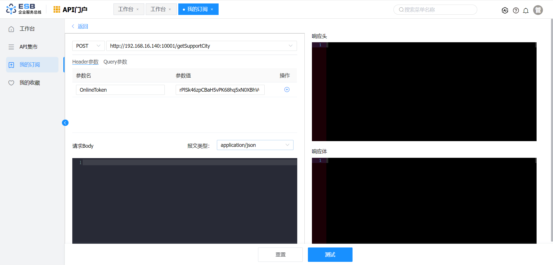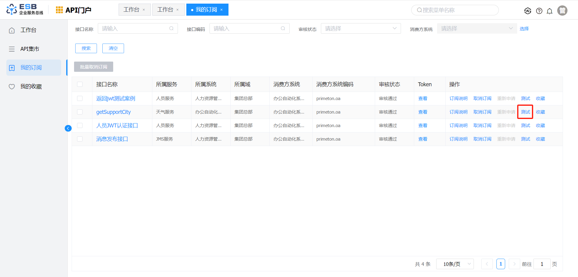 1. 在”我的订阅”页面,找到刚才订阅的接口信息,点击”测试”按钮,进入到”测试”页面。