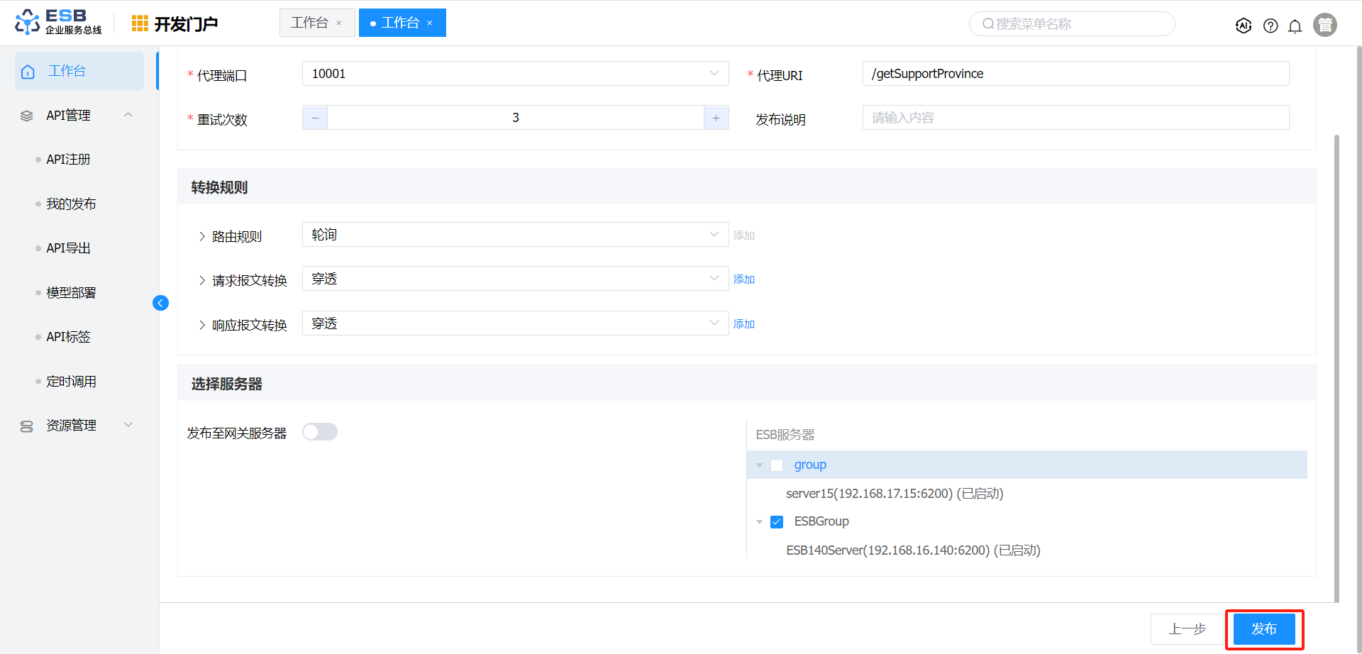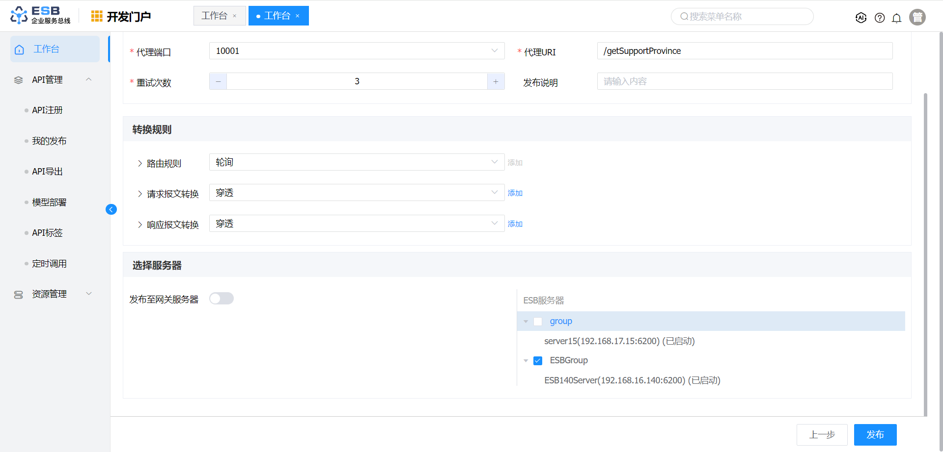 10. 选择”代理端口”,填写”代理URI”,这里填写上一步选择接口的名称作为代理URI,选择ESB服务器,即可完成接口信息配置。