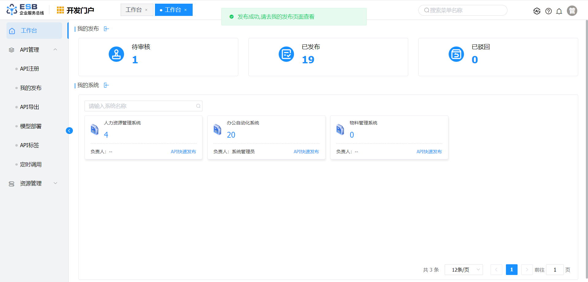 1. 发布成功后,系统会自动跳转到”工作台”页面,显示发布成功信息。