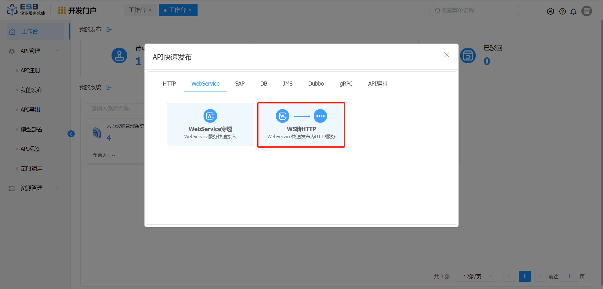 3. “API快速发布“弹窗,选择”WebService“页签,点击”WS转HTTP“按钮,进入”WS转HTTP“页面。
