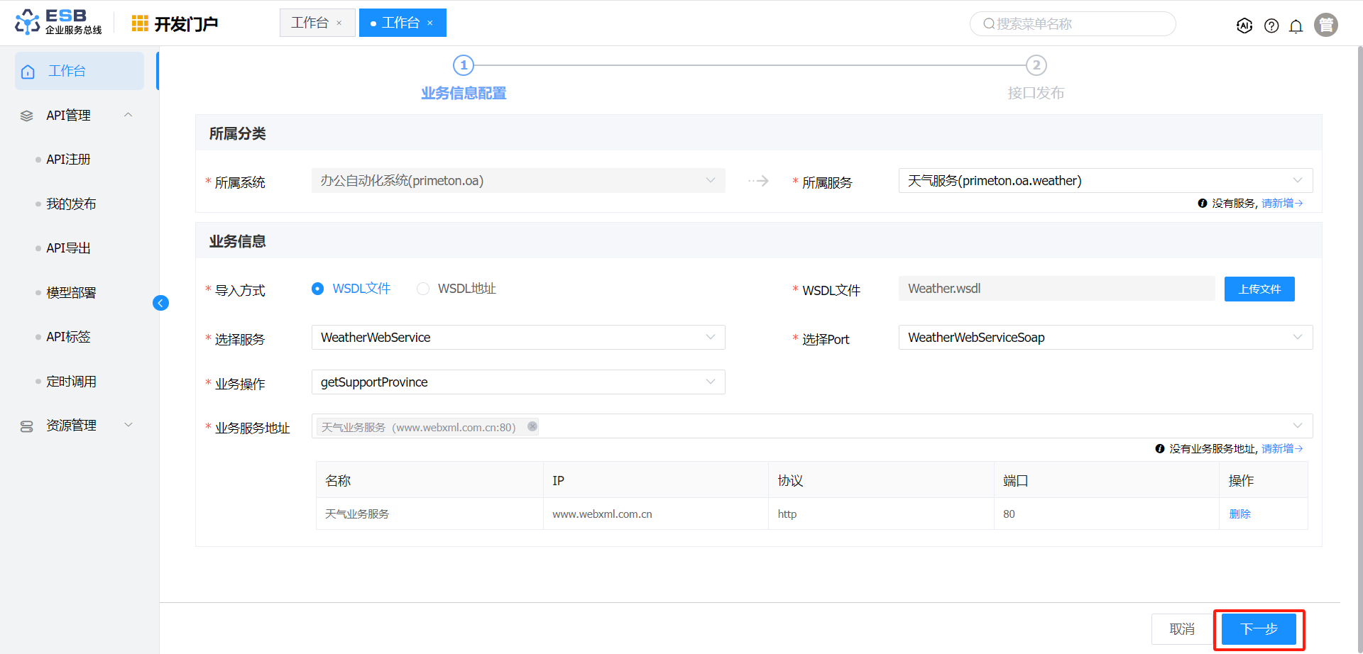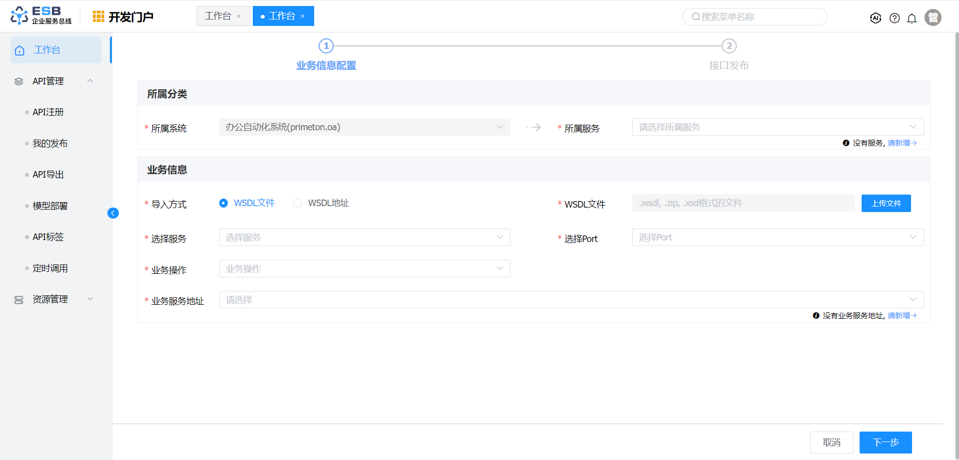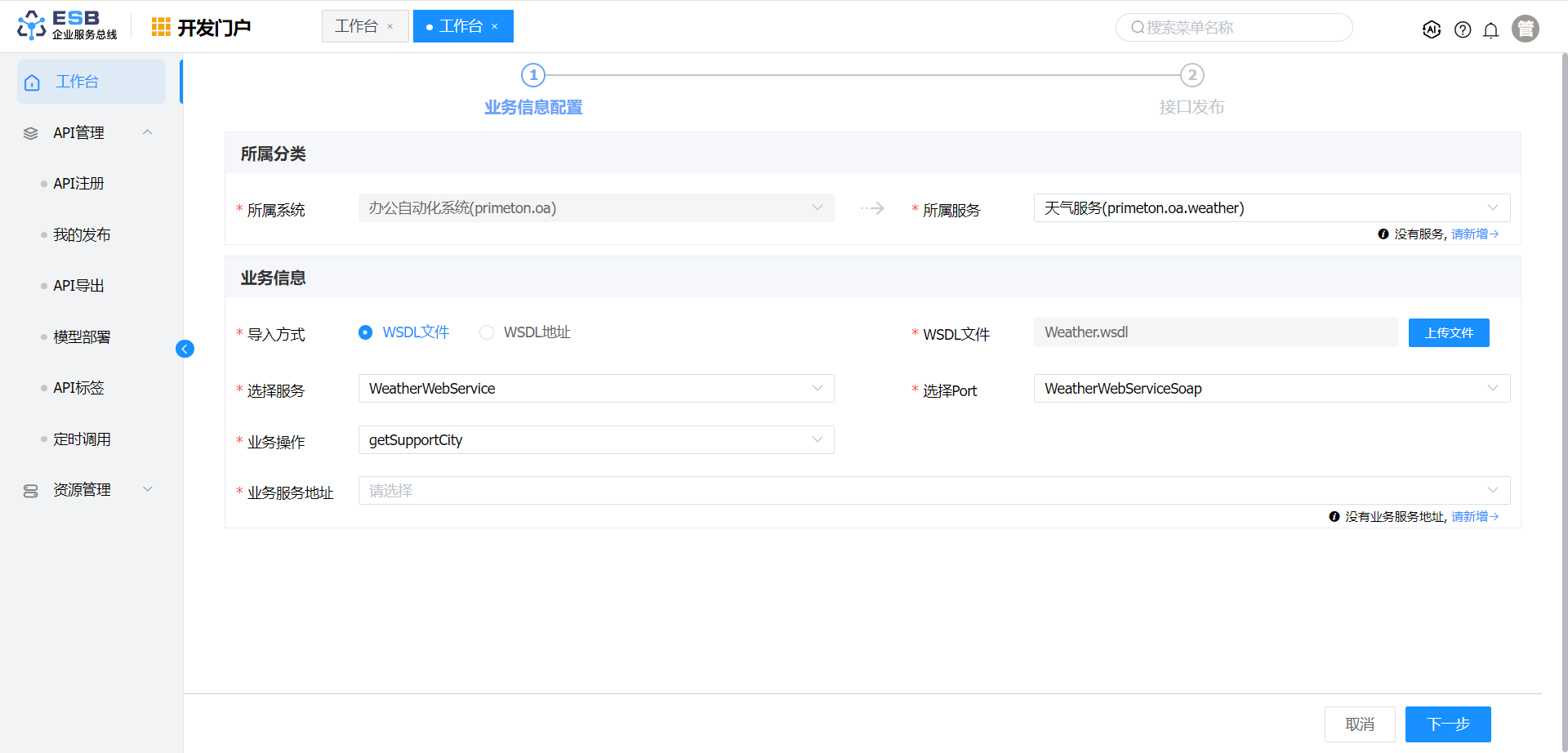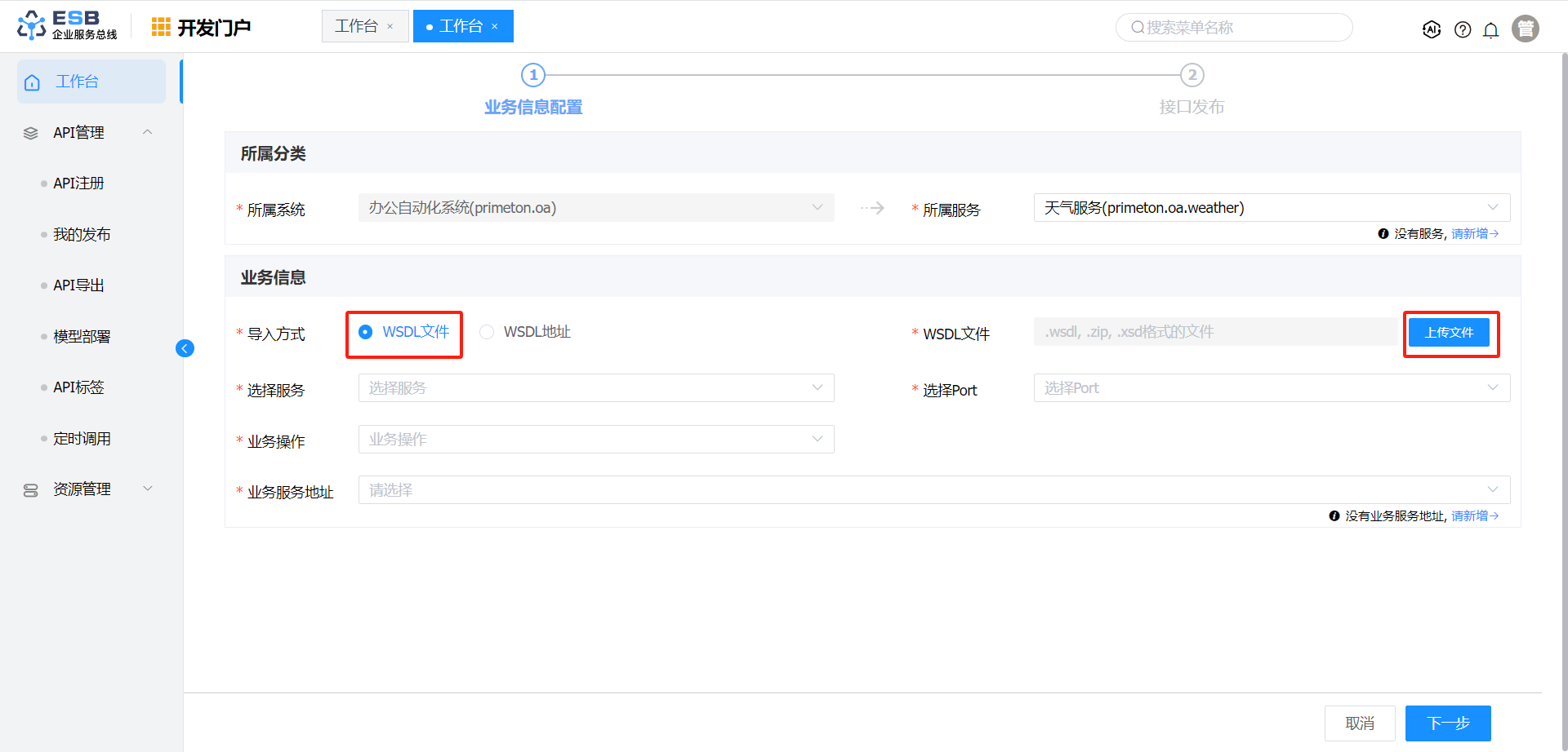6. 在业务信息模块的”WSDL文件”处,选择上传准备好的WSDL文件,即可完成接口导入。 ”WSDL地址”操作类似,可以直接填写WSDL地址进行接口导入。