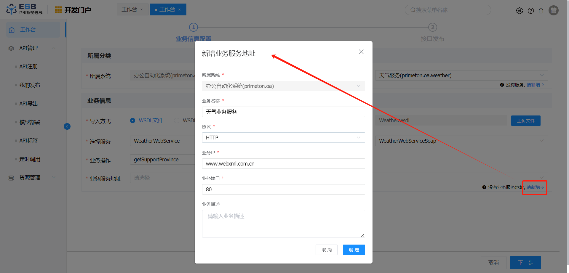 8. 在”业务服务地址”处下拉选择”业务服务”。 如果当前没有配置”业务服务”,因此需要先点击”业务服务地址”下拉框下方的”请新增”按钮,进入到”新增业务服务地址”页面。 填写业务服务地址相关信息,点击”确定”按钮,完成新增业务服务地址。
