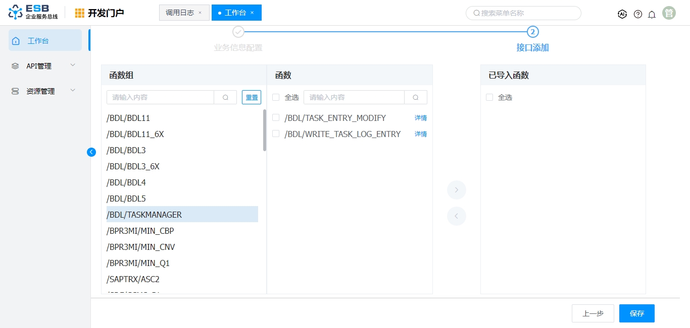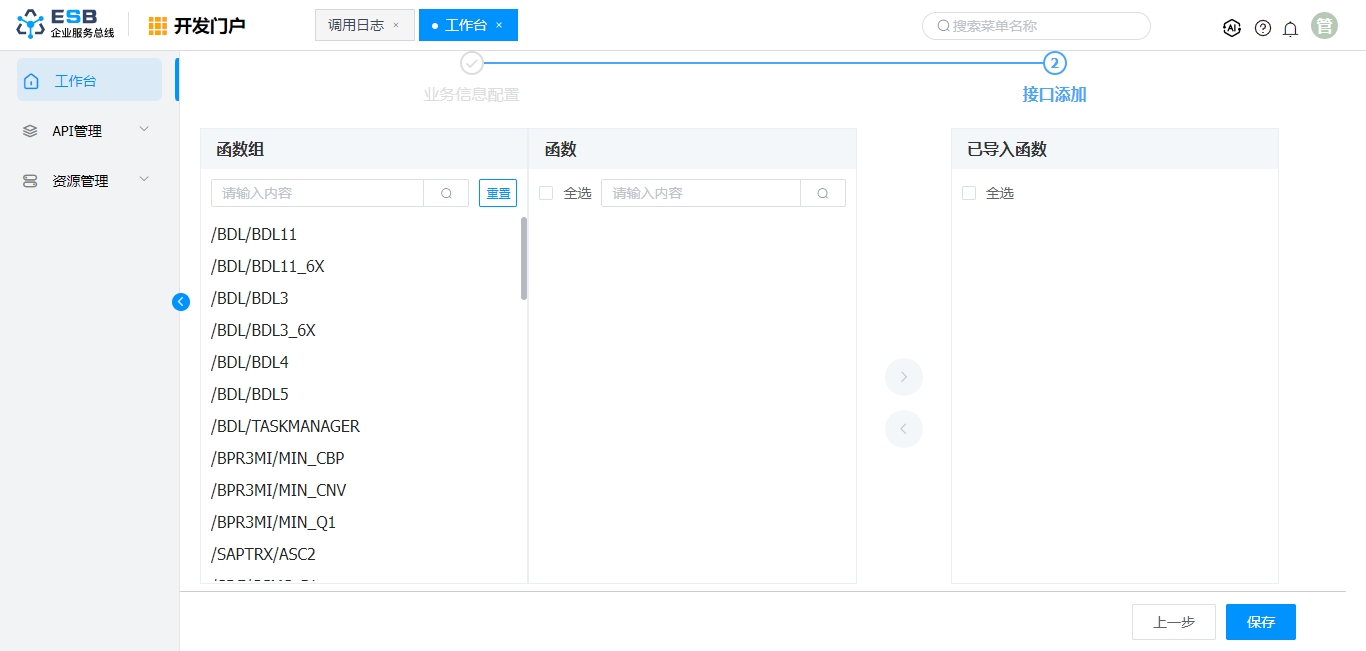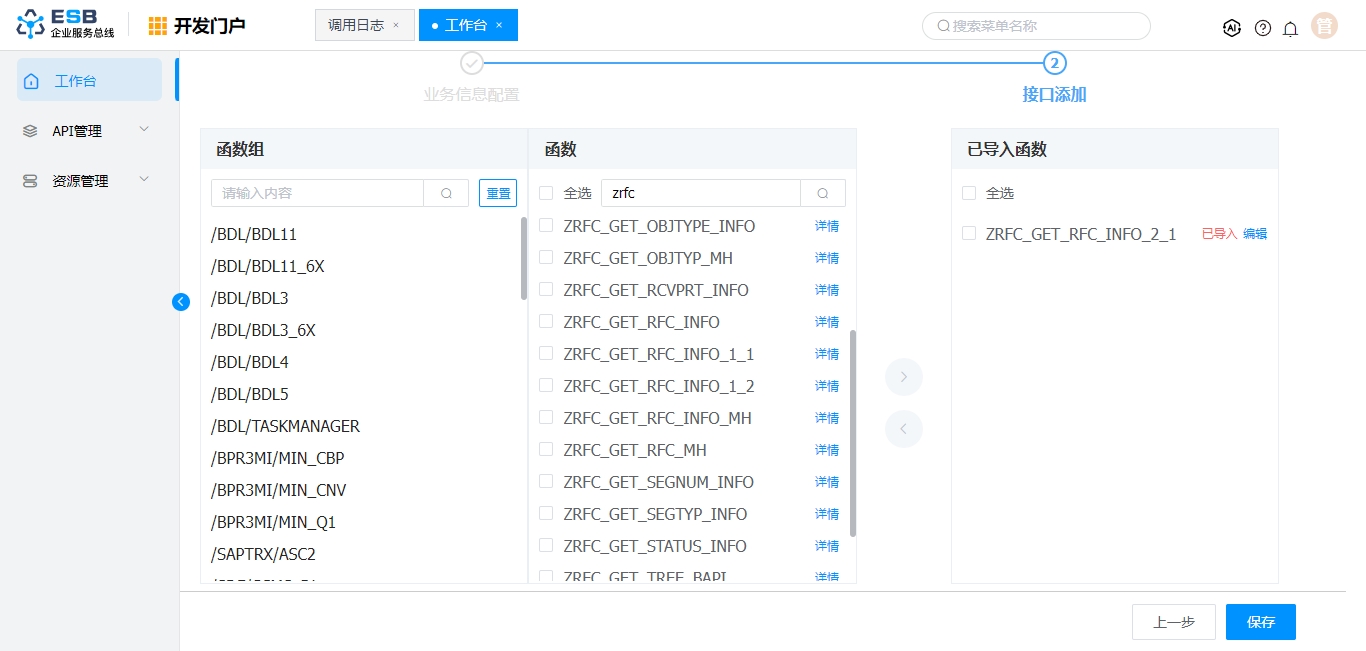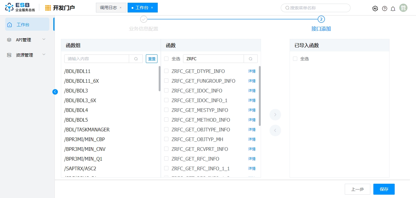 在接口添加页面默认会展现所选SAP系统下的所有函数组,点击列表中的函数组,在中间函数栏中会列出该组下的函数。