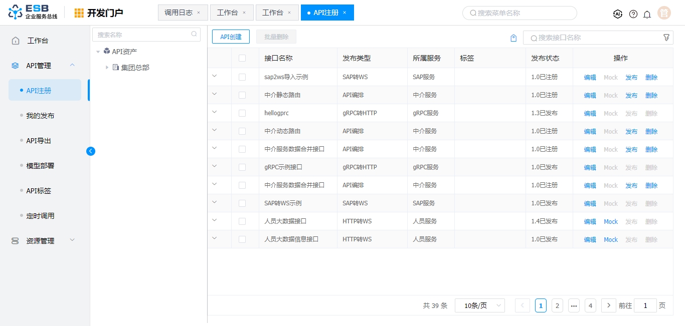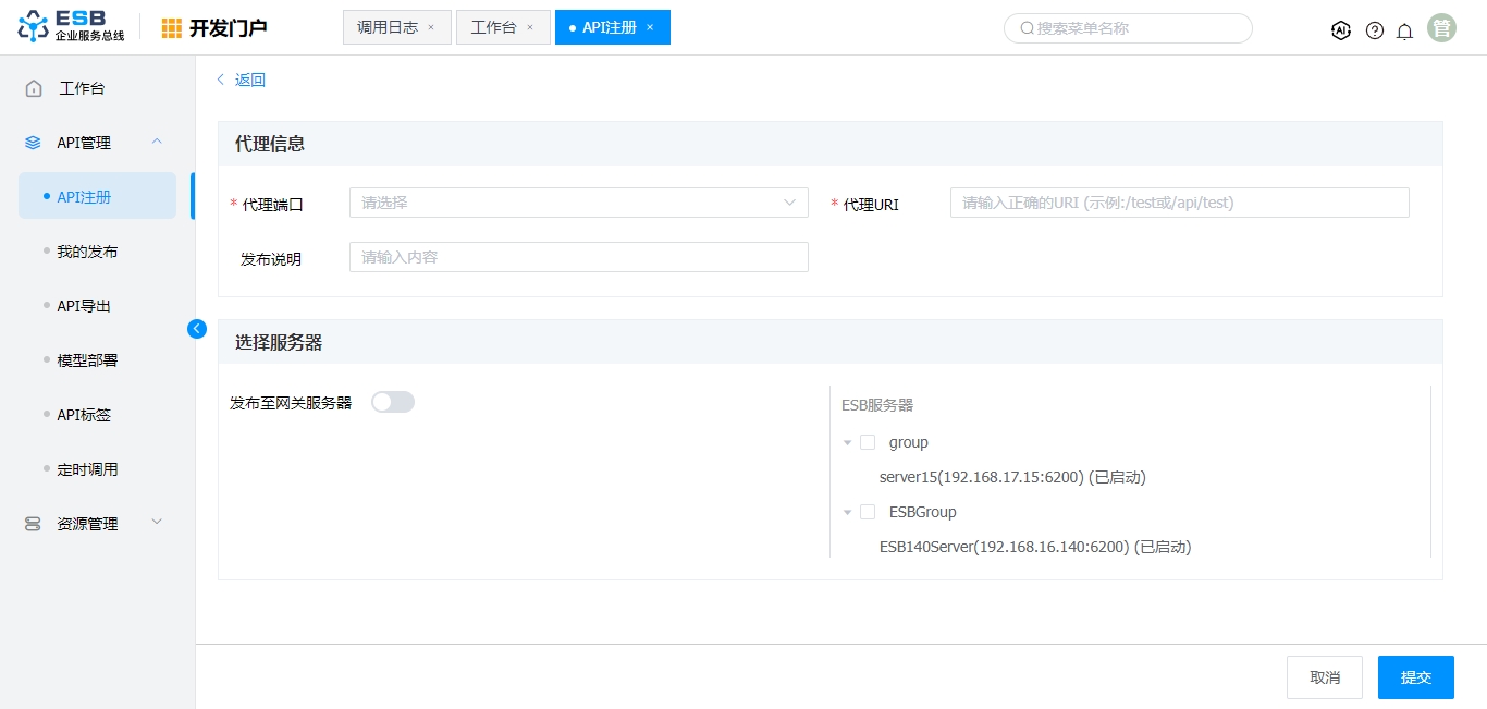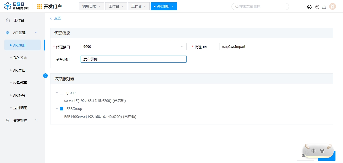 ESB服务器 | 选择ESB服务器组,发布接口 |