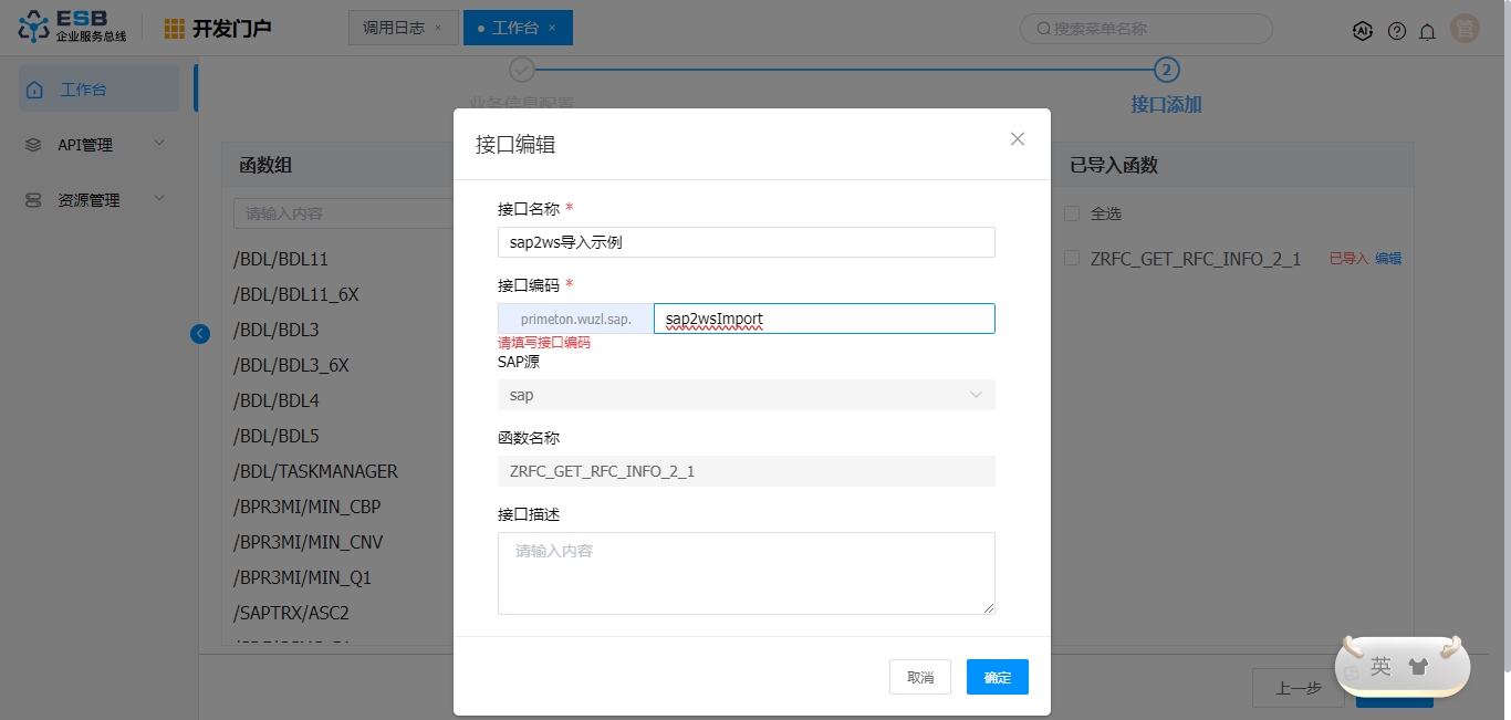 此场景选择:sap导入SAP源 SAP系统连接配置 接口描述 业务接口描述 “业务信息配置”信息填写完成后,点击“下一步”按钮,进入“接口添加”页面。