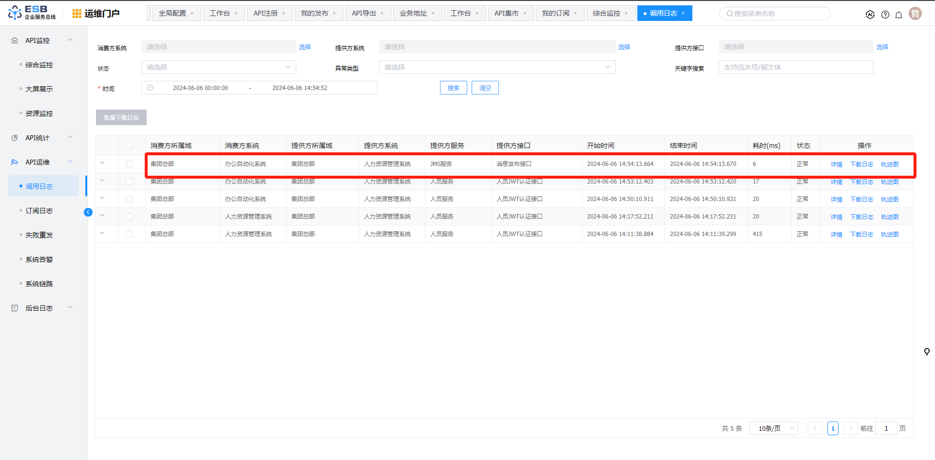 点击菜单“API运维”>"调用日志",进入“调用日志”页面。