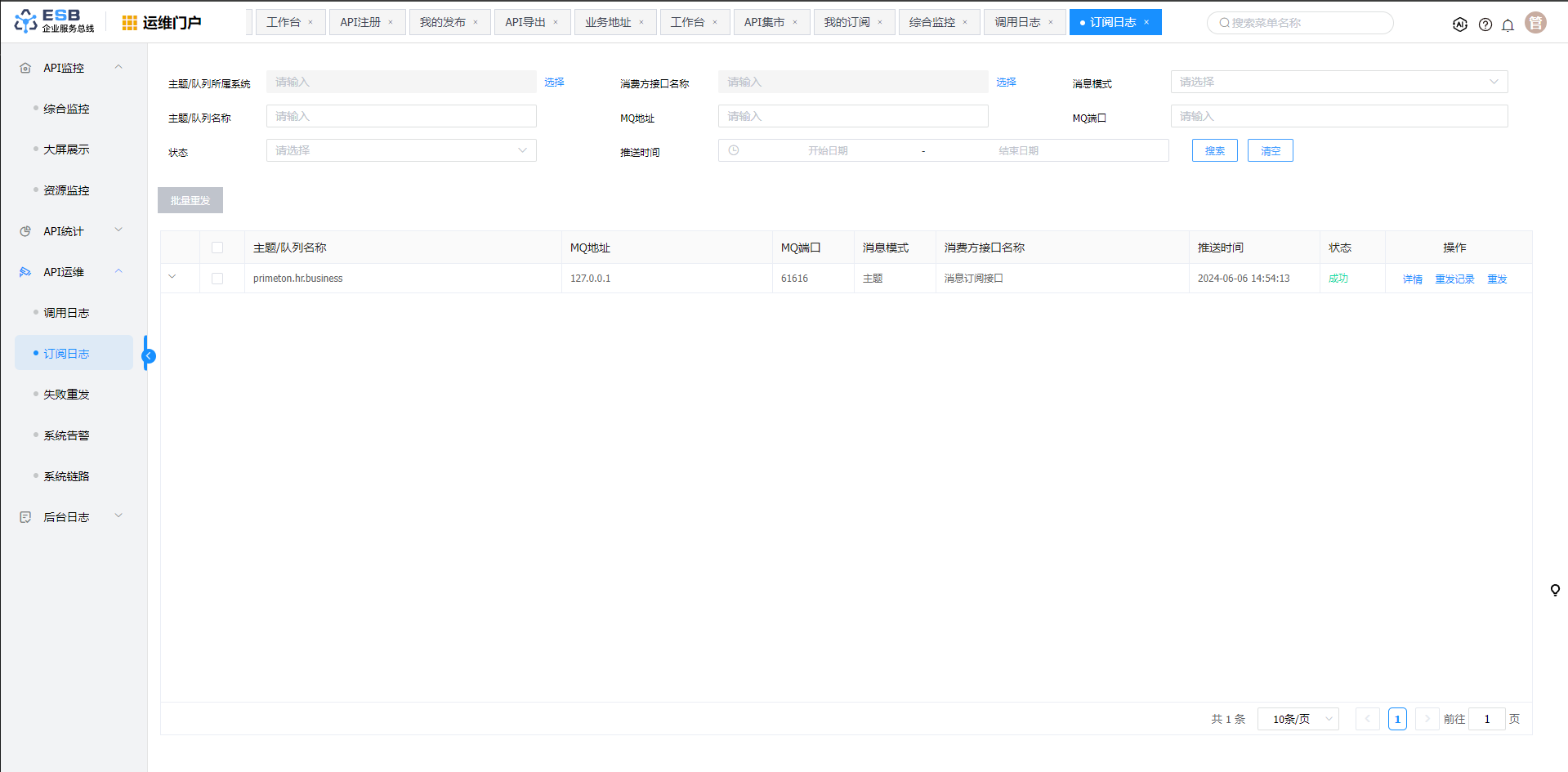 点击菜单“API运维”>"订阅日志",进入“订阅日志”页面。
