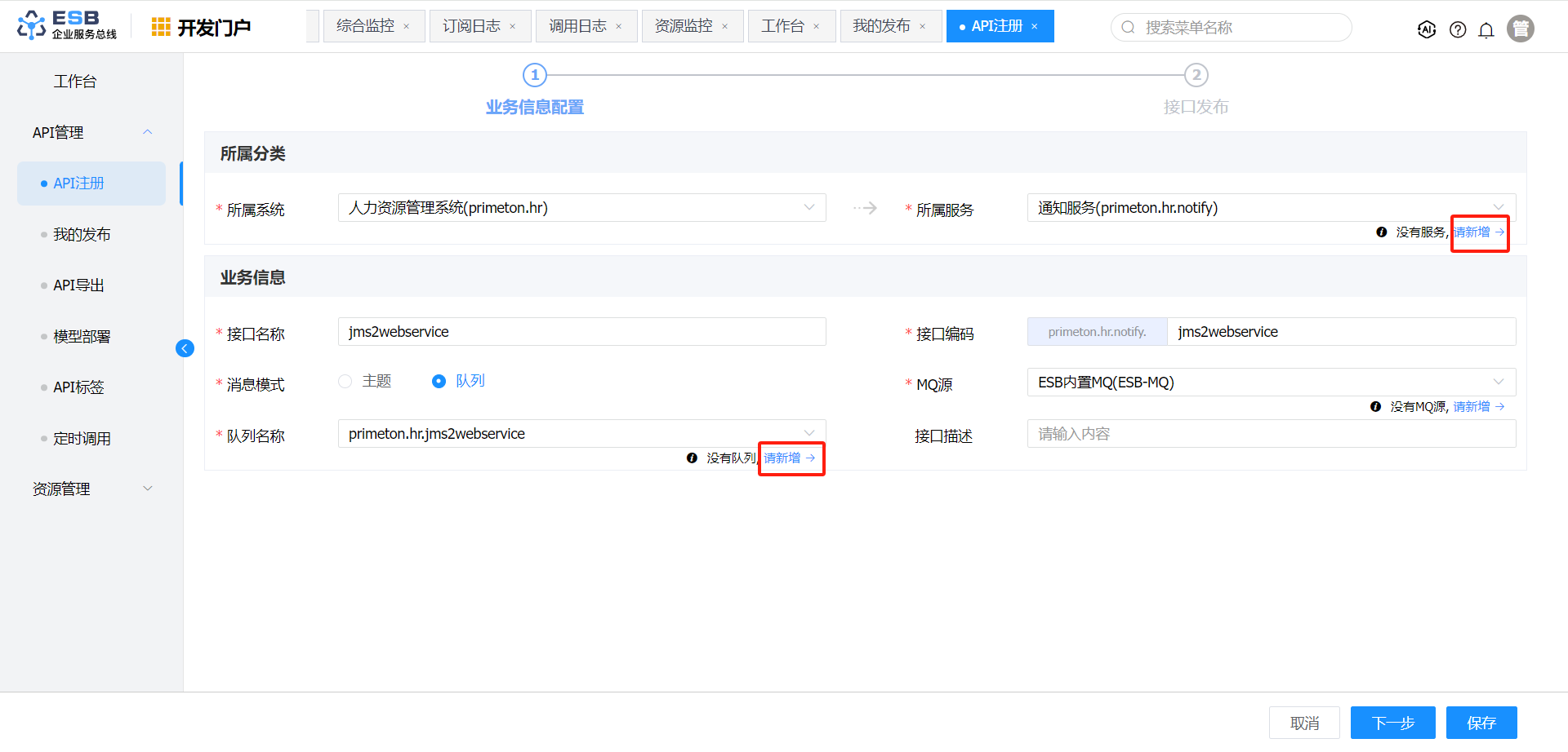 3.“API快速发布“弹窗,选择”JMS“页签,点击”JMS转WS“按钮,进入”JMS转WS“接口发布页面