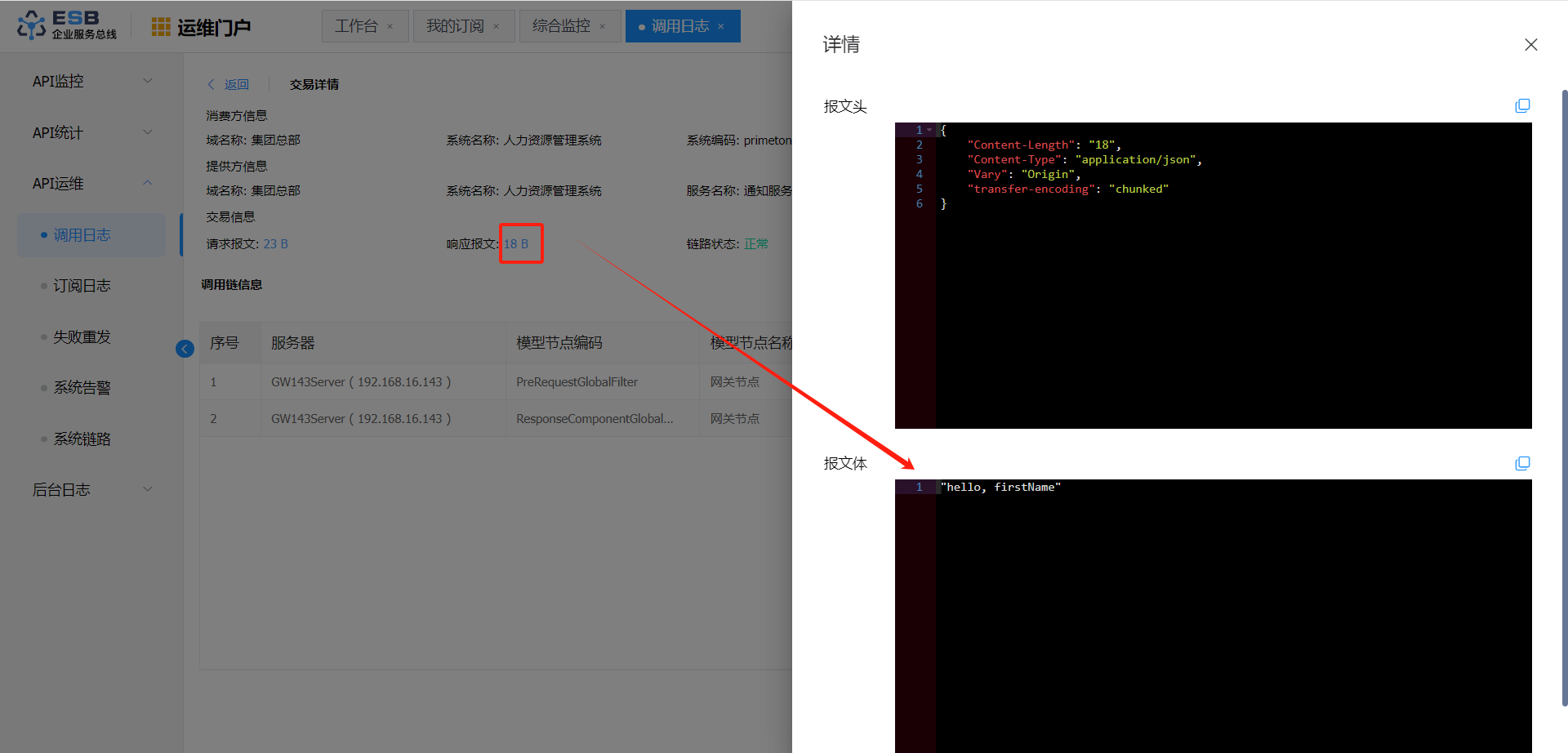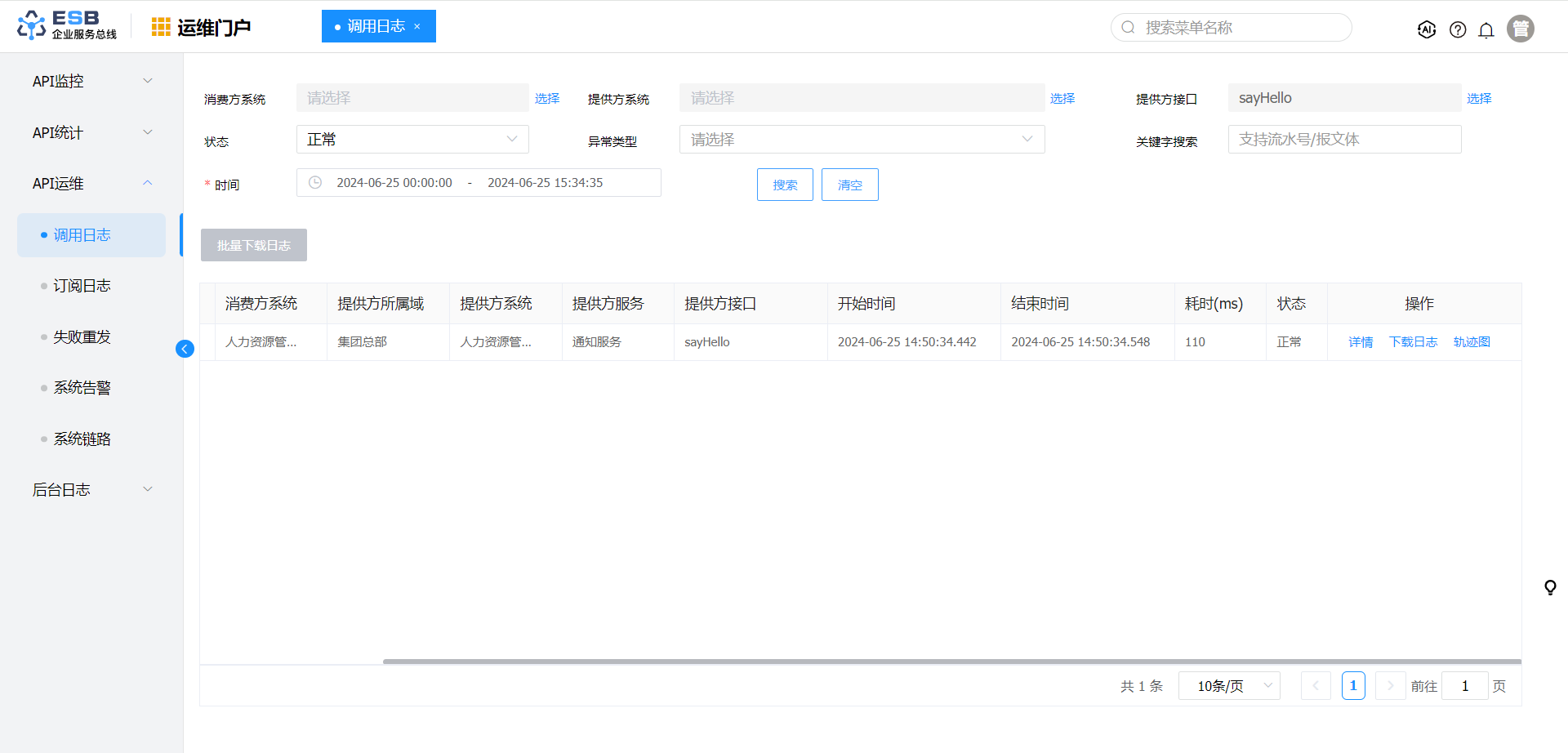 2. 点击菜单“API运维”>"调用日志",进入“调用日志”页面。