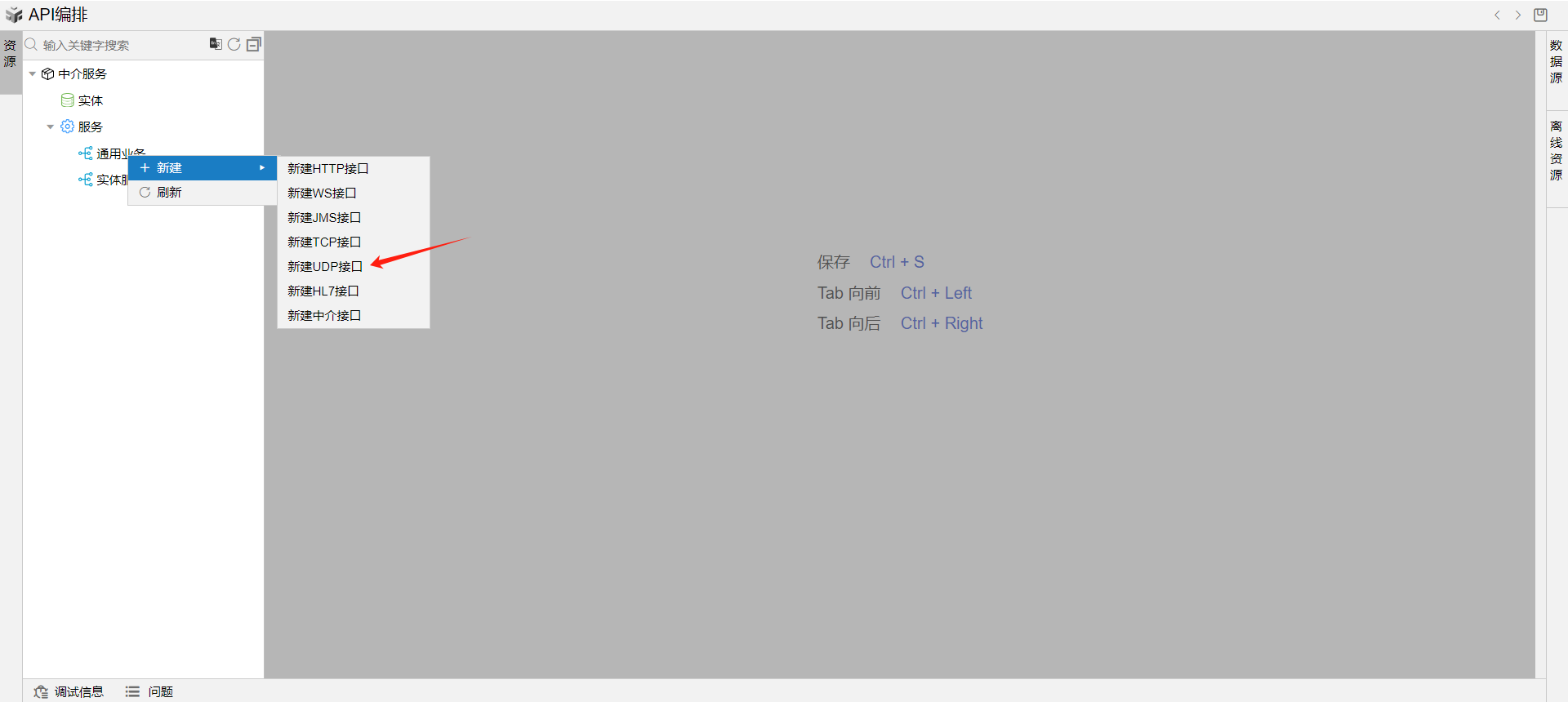 在线编排页面中的通用业务目录上点击右键,点击新建并点击新建UDP接口,然后如下图所示填写数据,并点击保存确定。
