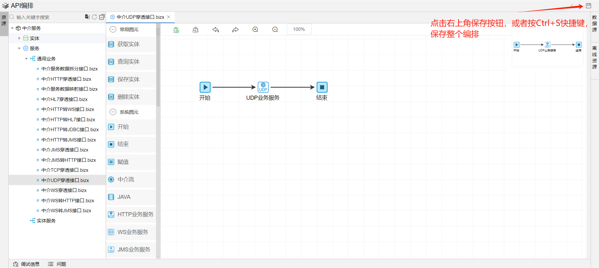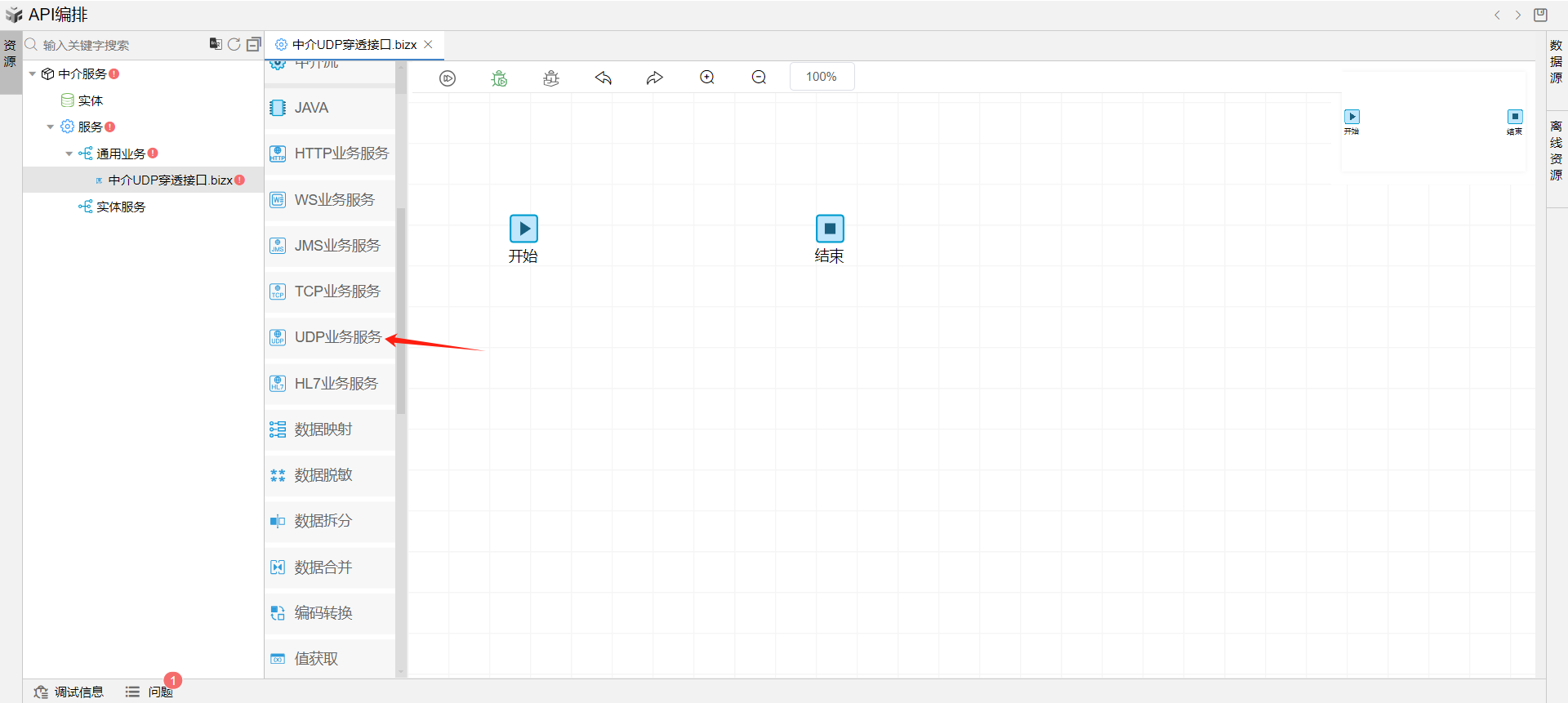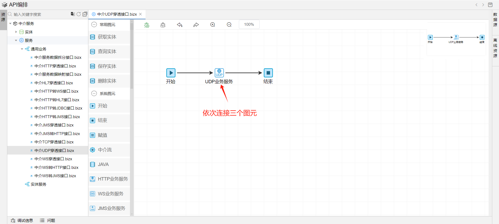 保存成功后系统自动打开中介编排页面,如下图所示。从左侧拖一个UDP业务服务图元到开始和结束图元中间,并依次连接各个图元。如下图: