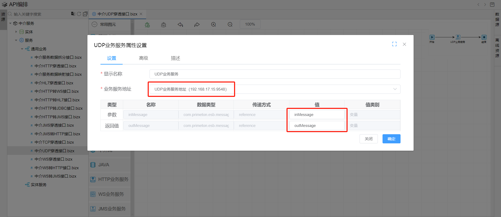 双击打开UDP业务服务图元,业务地址下拉框选择中介UDP业务服务地址,下方表格中的参数和返回值分别选择inMessage和outMessage,然后点击确定按钮关闭对话框。如下图: