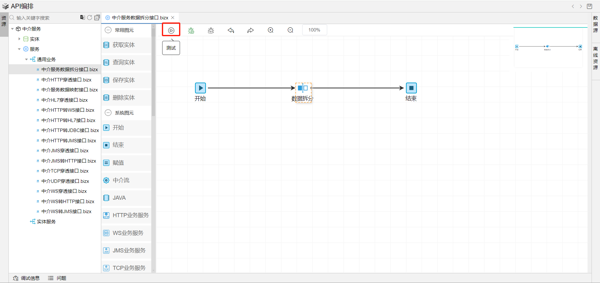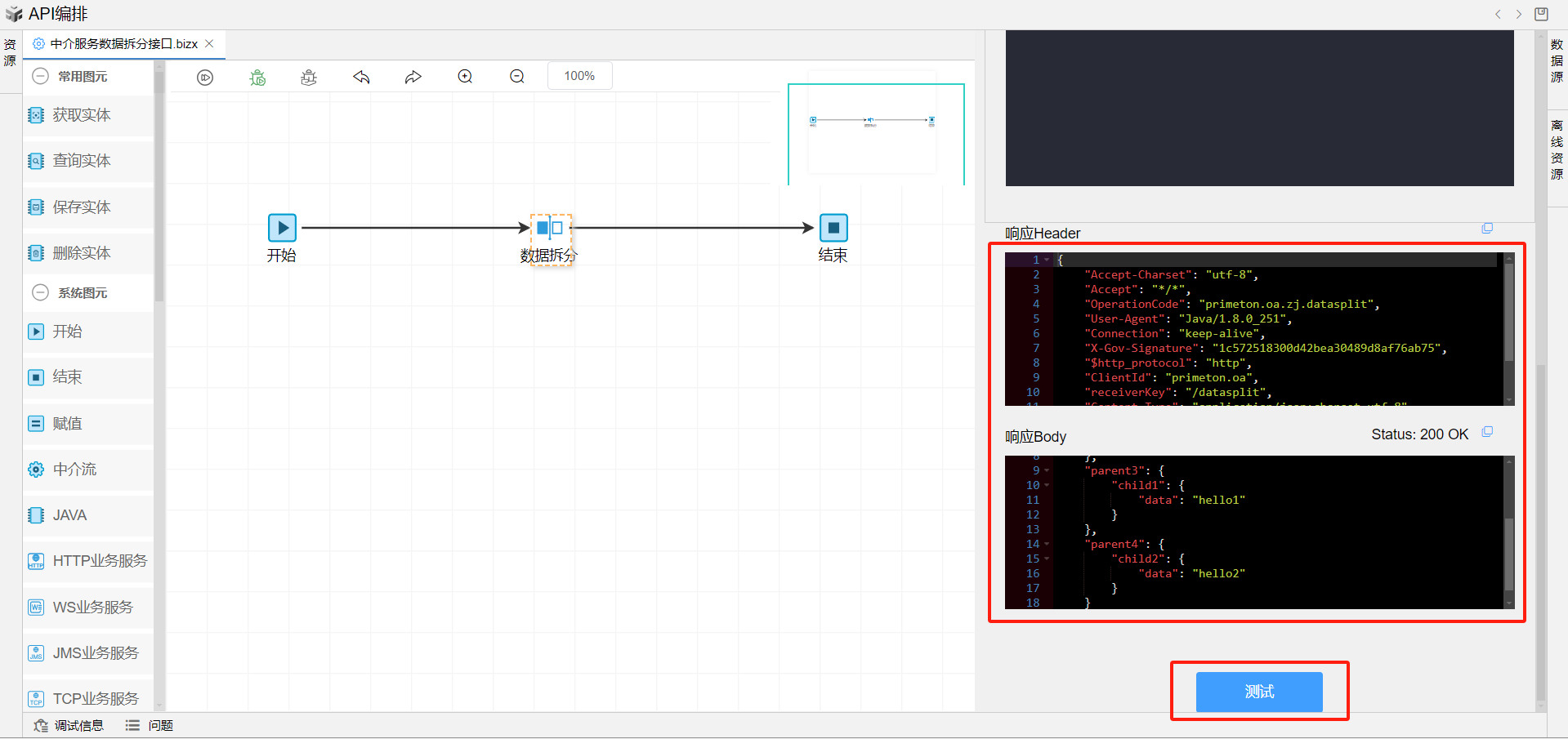 在线编排页面保存成功后,点击界面上方的测试按钮,如下图: