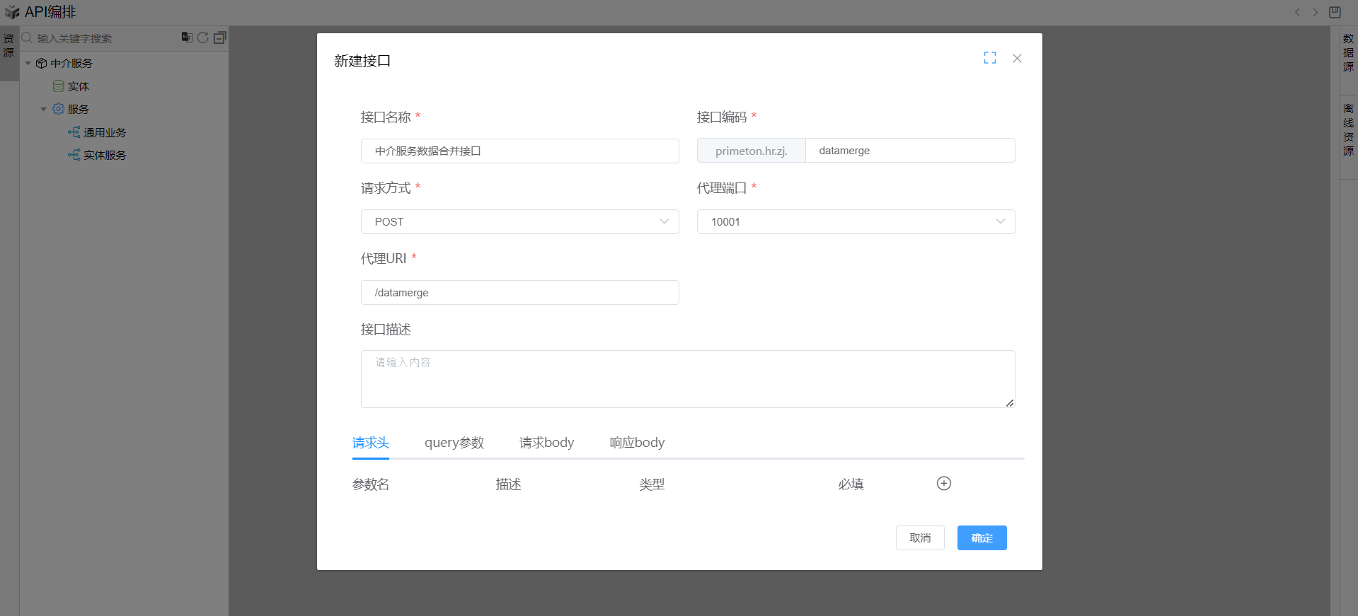 在线编排页面中,在通用业务目录上点击右键,点击新建并点击新建HTTP接口,然后如下图所示填写数据并点击保存确定。