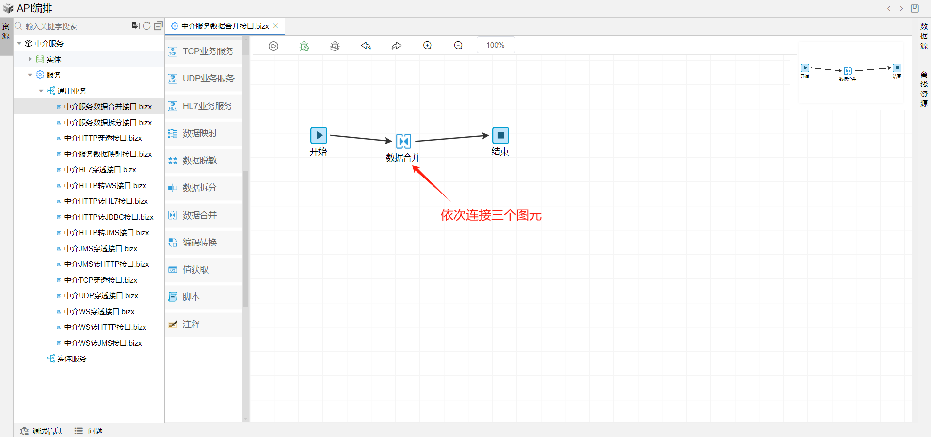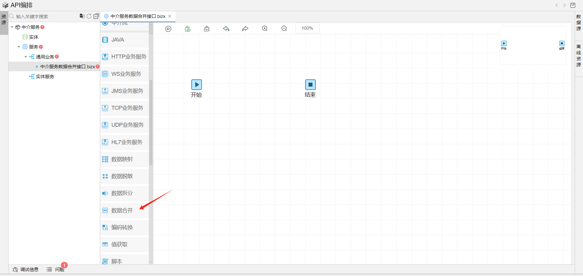 保存成功后系统自动打开中介编排页面。从左侧拖一个数据合并图元到开始和结束中间,并依次连接各个图元。如下图: