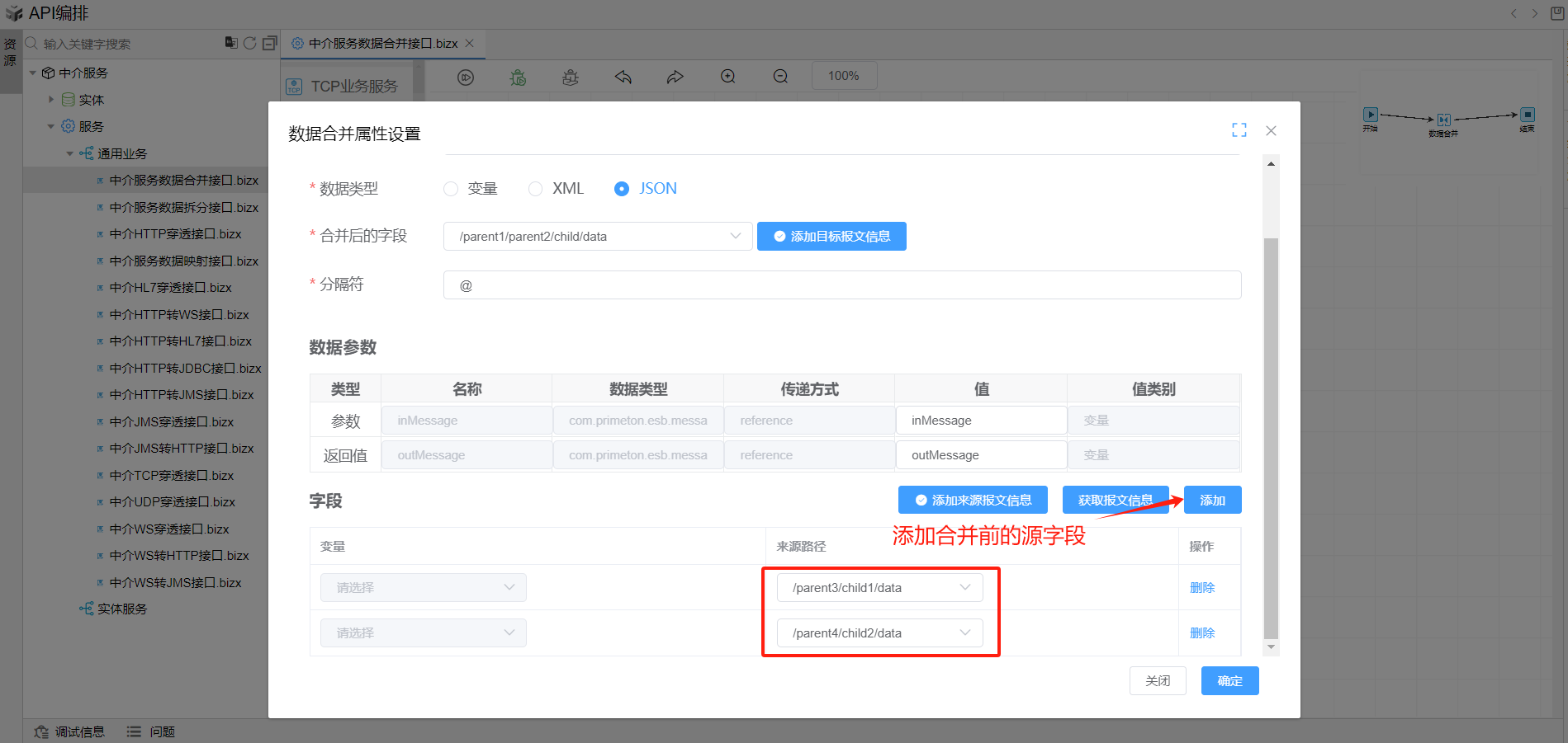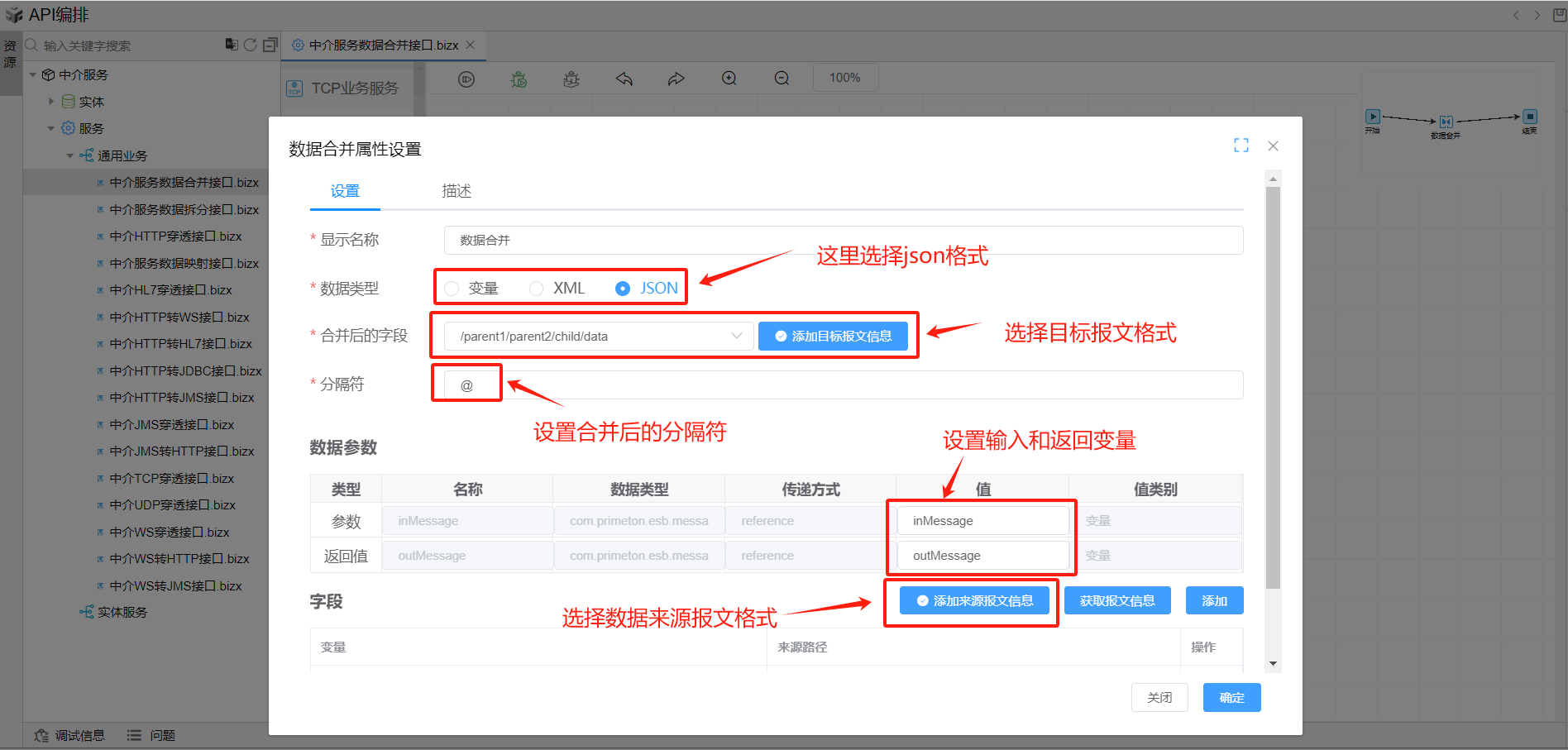 双击打开数据合并图元,在属性设置tab页,设置数据格式,添加合并后目标报文格式,选择要拆分的字段,设置分隔符,设置输入和返回变量,并添加合并前报文格式。如下图: