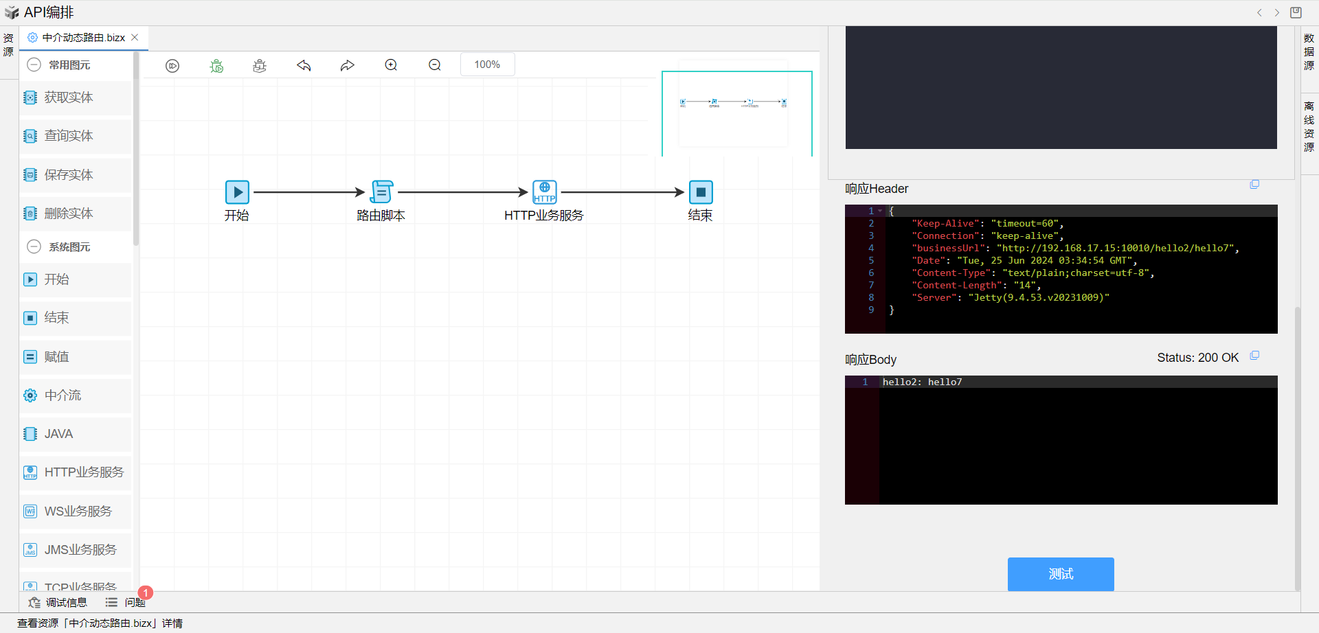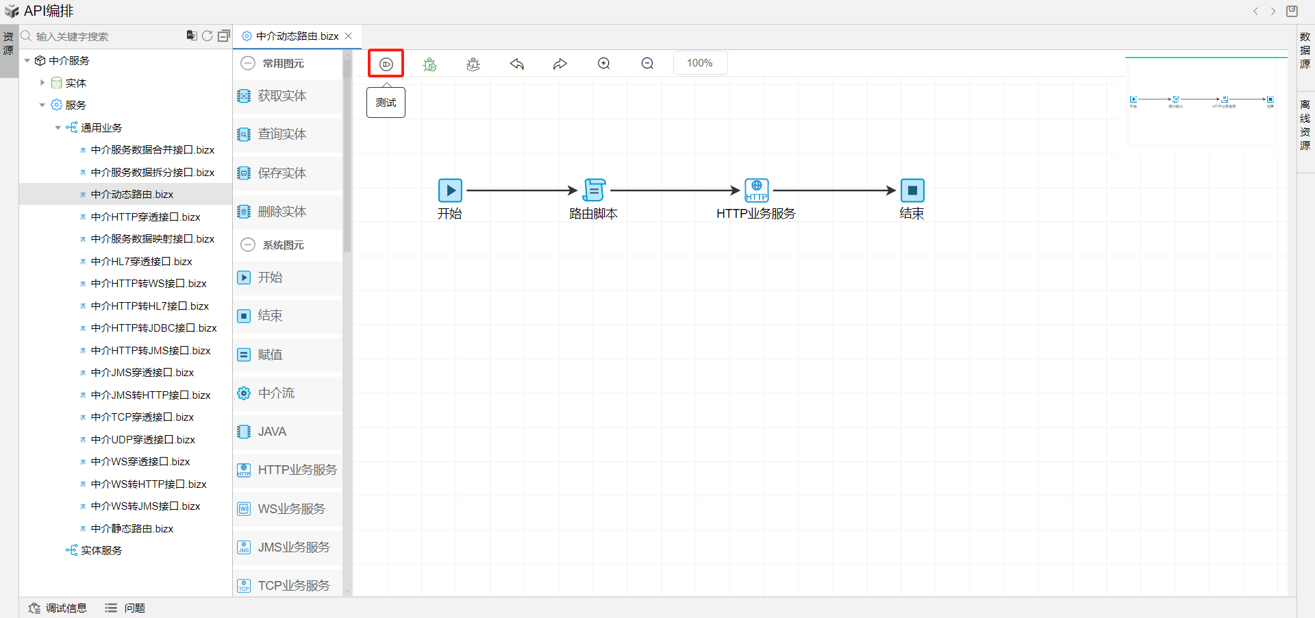 在线编排页面保存成功后,点击界面上方的测试按钮,如下图: