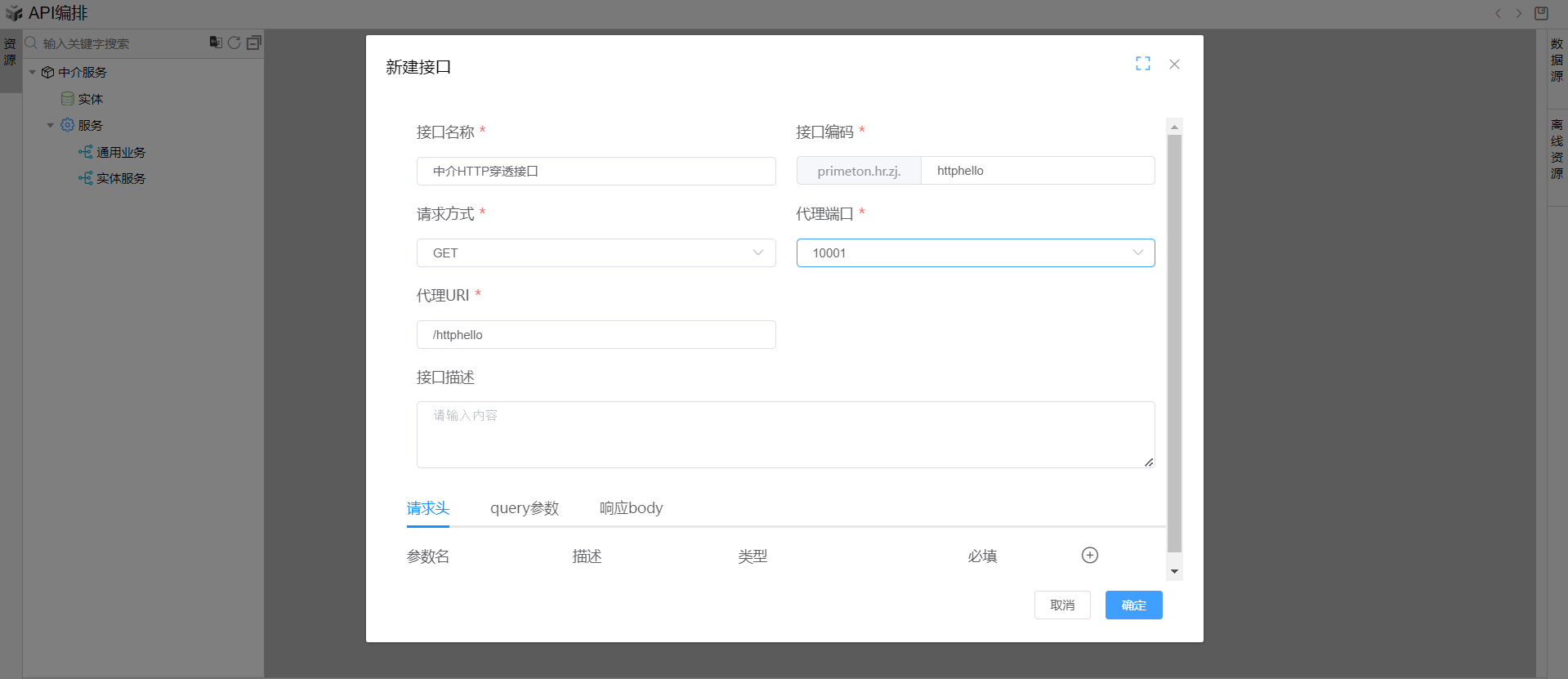 2. 在线编排页面中的通用业务目录上点击右键,点击新建后点击新建HTTP接口,然后如下图所示填写数据并点击保存确定。