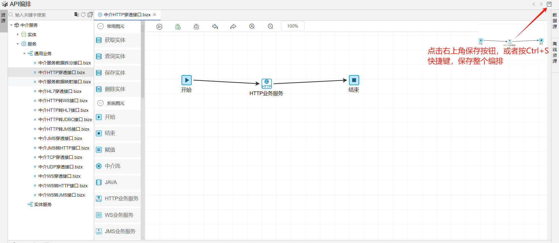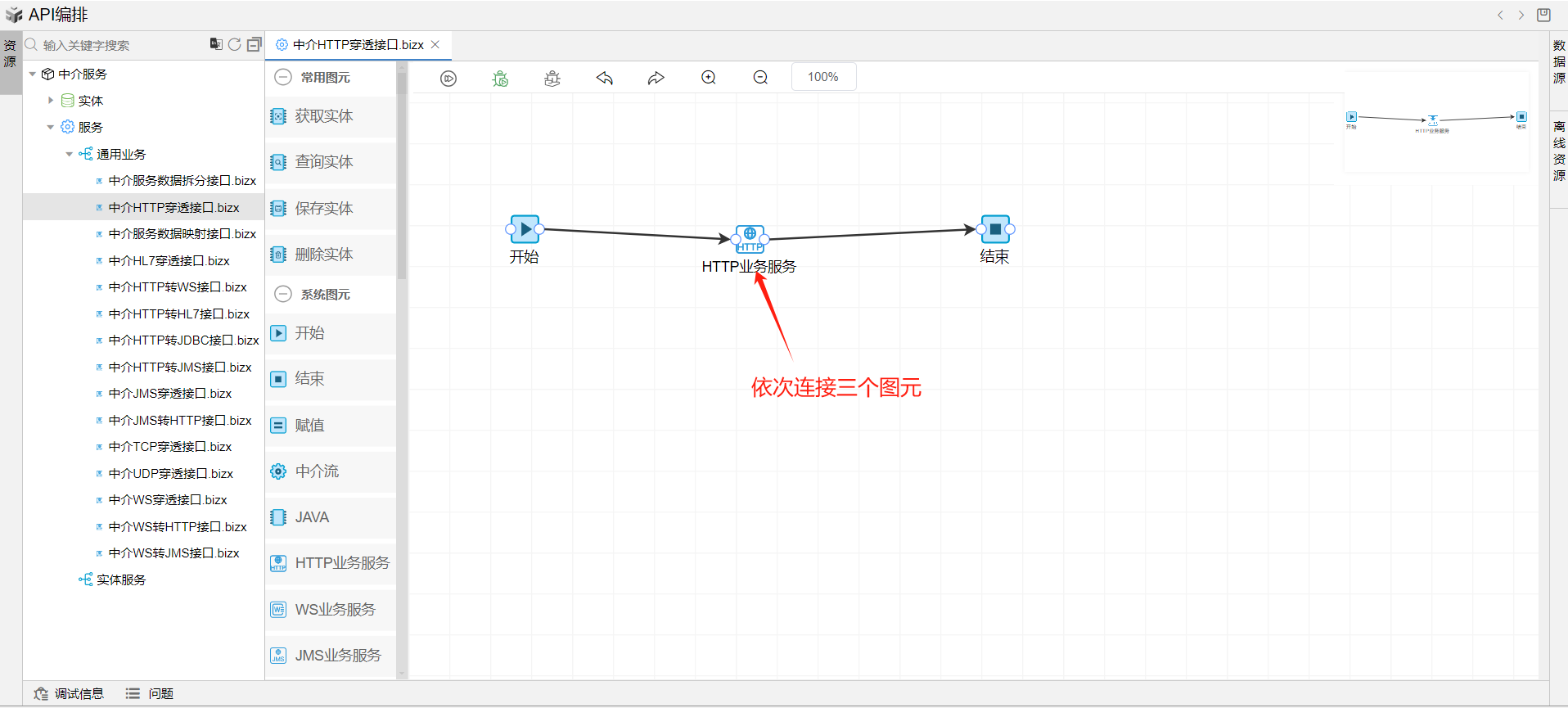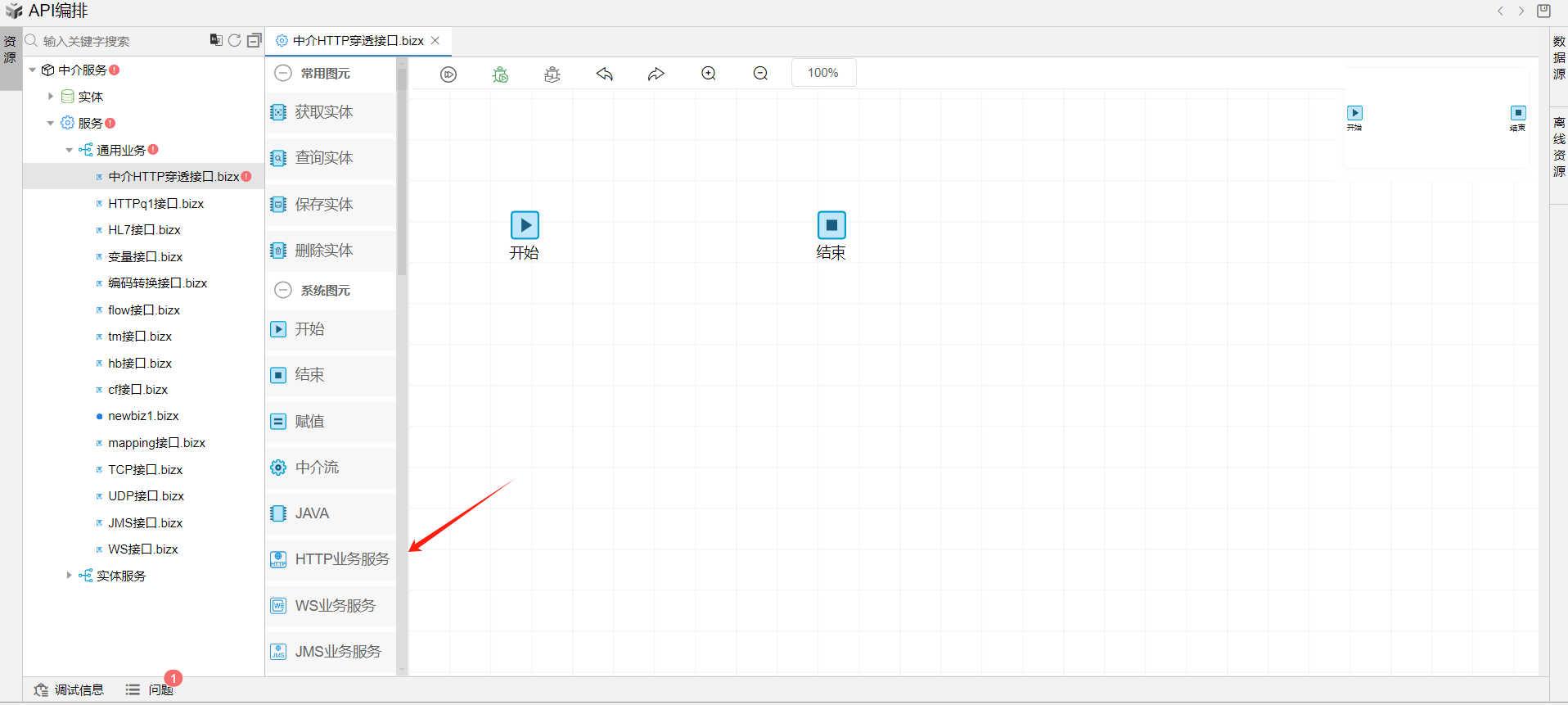 1. 保存成功后,系统自动打开中介编排页面,如下图所示。从左侧拖一个HTTP业务服务图元到开始和结束图元中间,并依次连接各个图元。如下图: