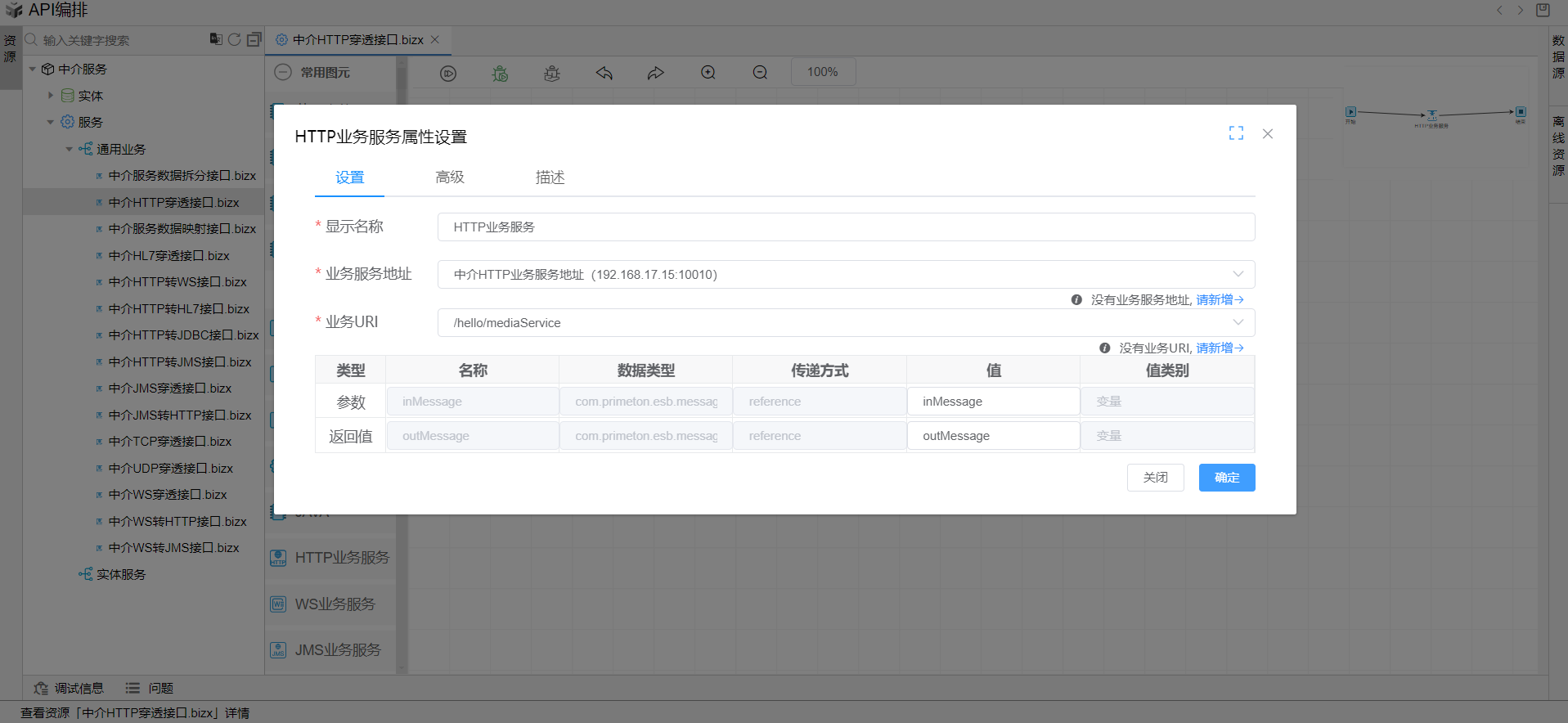 2. 双击打开HTTP业务服务图元,业务地址下拉框选择中介HTTP业务服务地址,业务url下拉框选择/hello/mediaService,下方表格中的参数和返回值分别选择inMessage和outMessage,然后点击确定按钮关闭对话框。如下图: