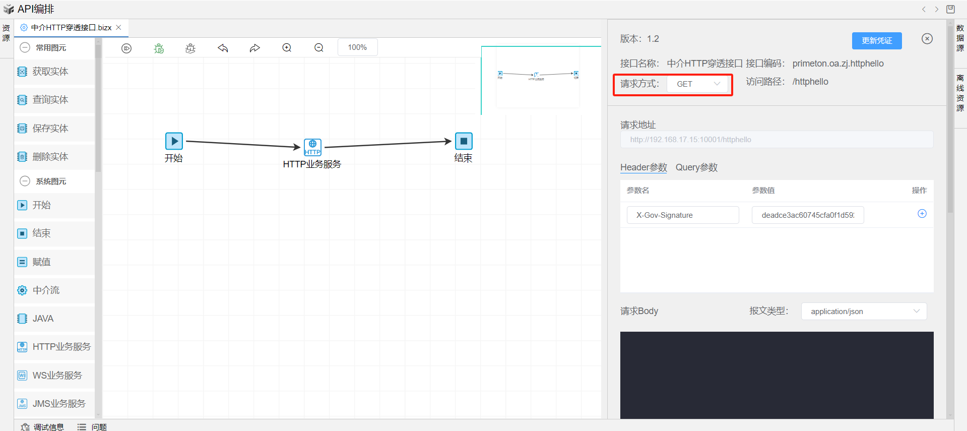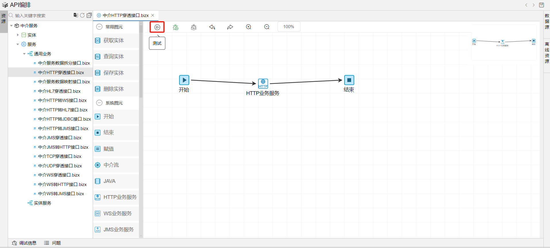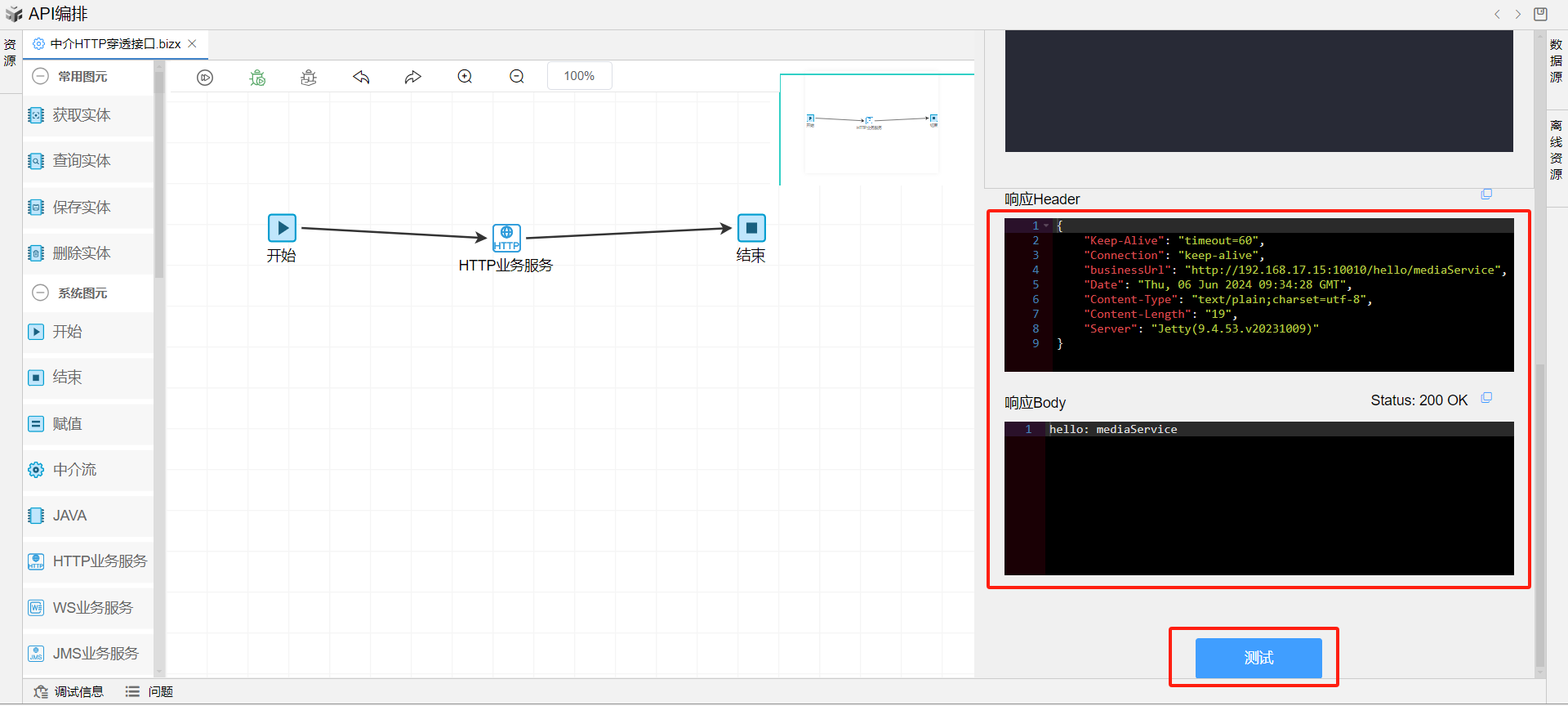 在线编排页面保存成功后,点击界面上方的测试按钮,如下图: