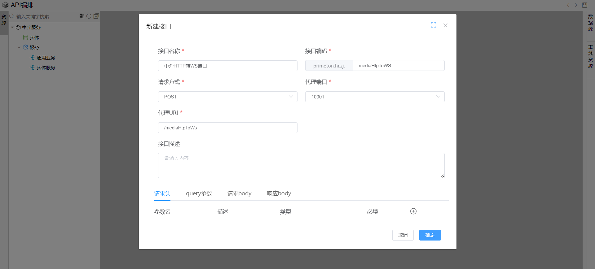 在线编排页面中,在通用业务目录上点击右键,点击新建,点击新建HTTP接口,然后如下图所示填写数据并点击保存确定。