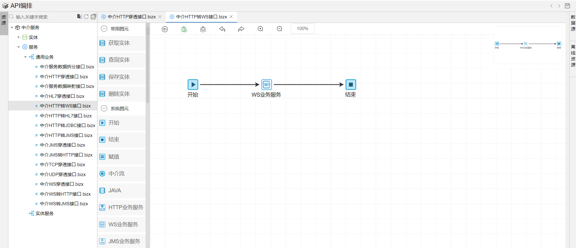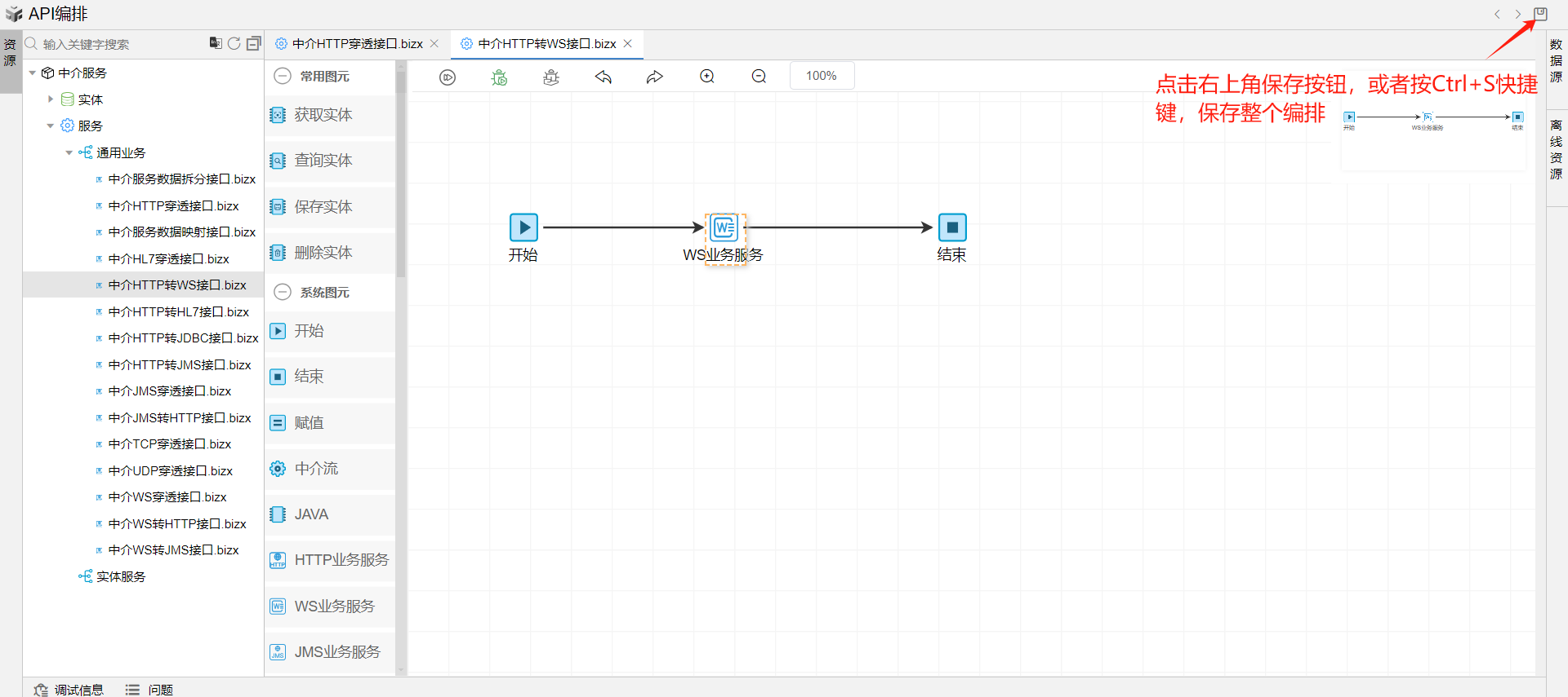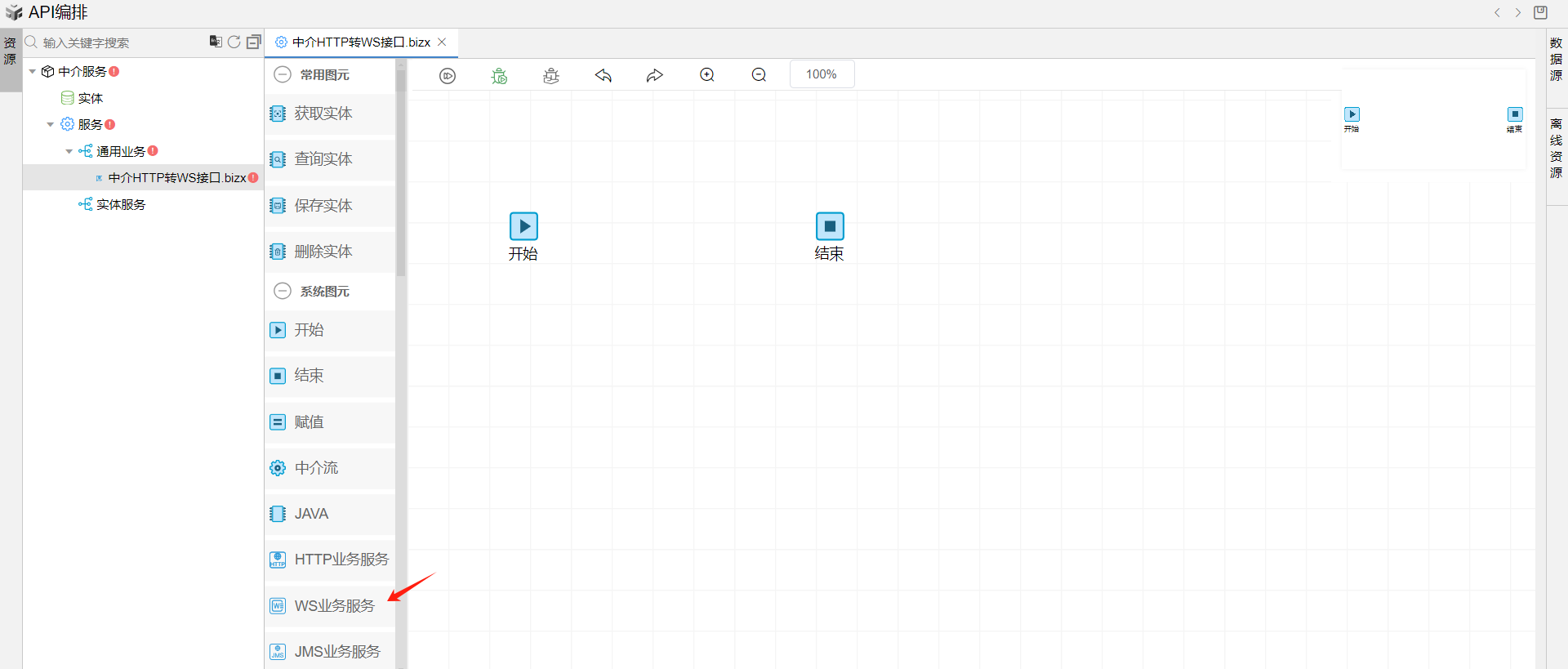 保存成功后,系统自动打开中介编排页面,如下图所示。从左侧拖一个WS业务服务图元到开始和结束图元中间,并依次连接各个图元。如下图: