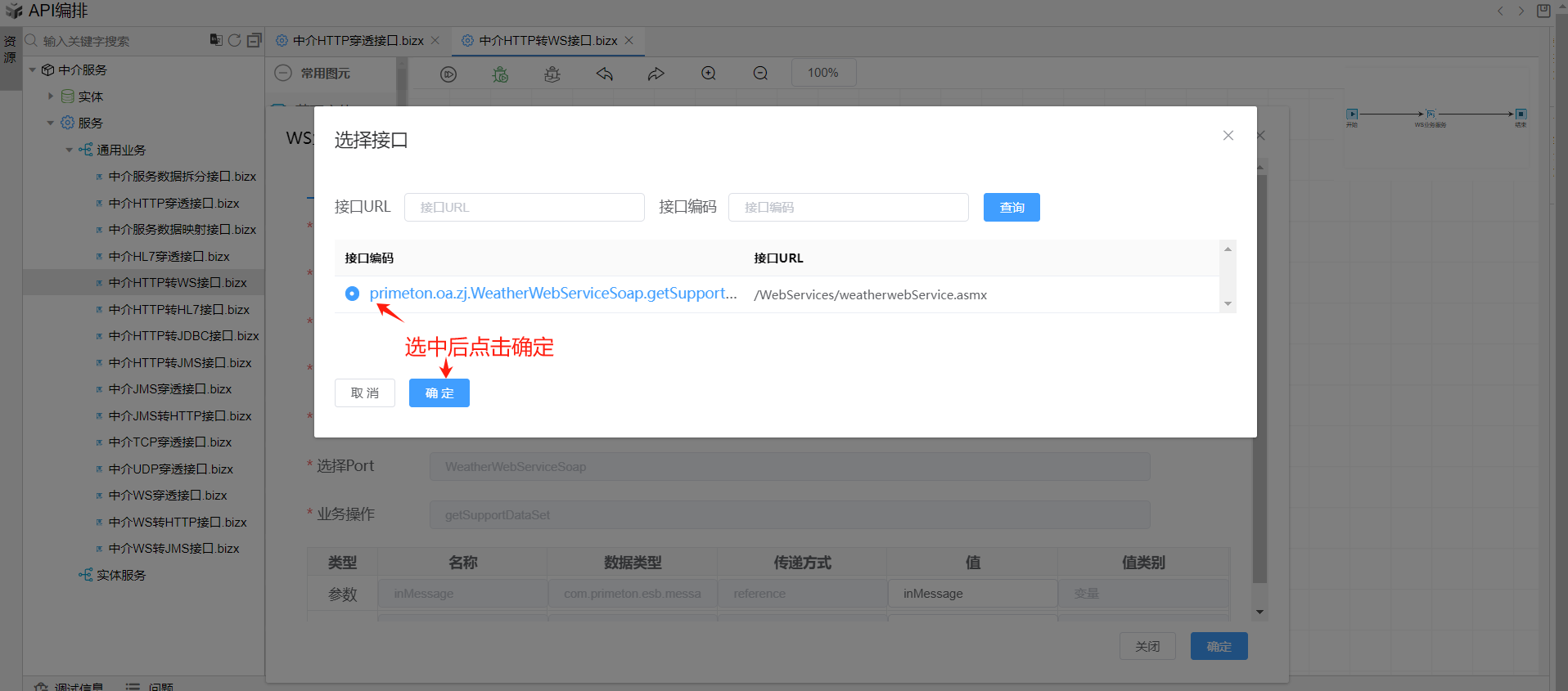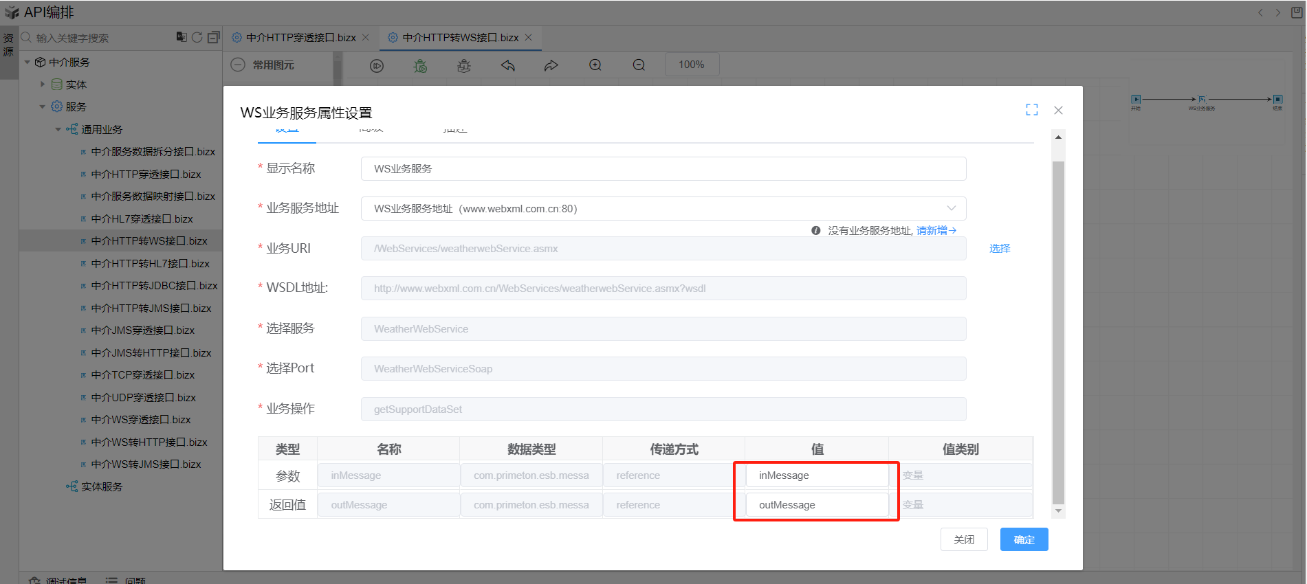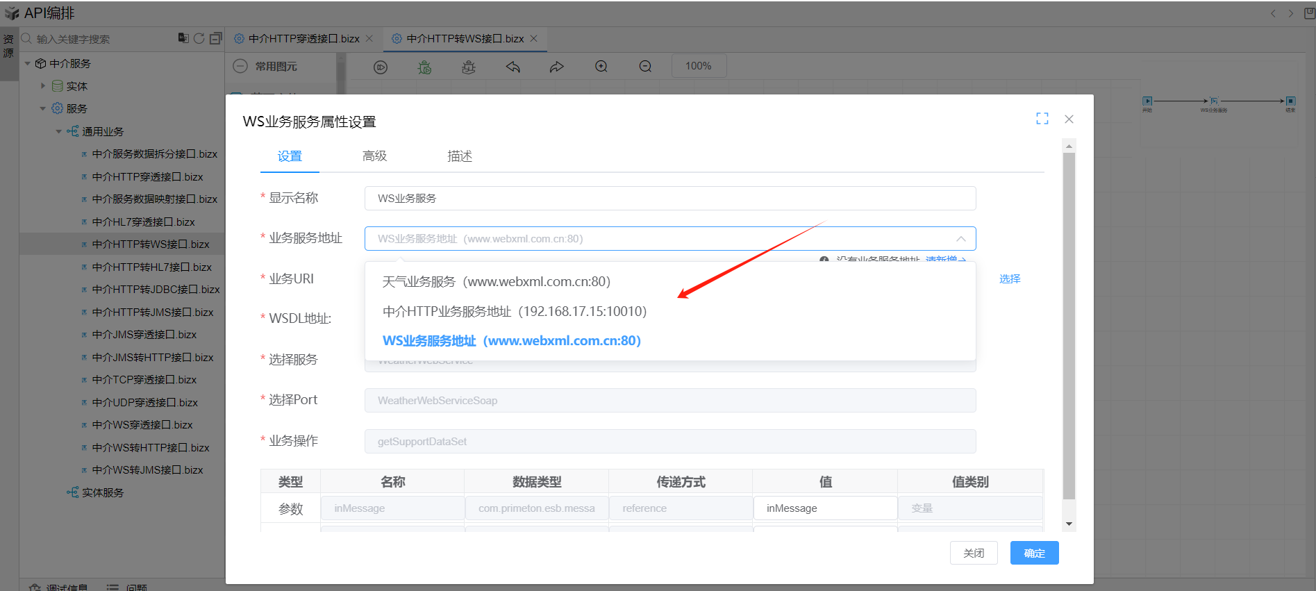 双击打开WS业务服务图元,业务地址下拉框选择中介WS业务服务地址,业务url选择我们在wsdl导入时导入的接口,下方表格中的参数和返回值分别选择inMessage和outMessage,然后点击确定按钮关闭对话框。如下图: