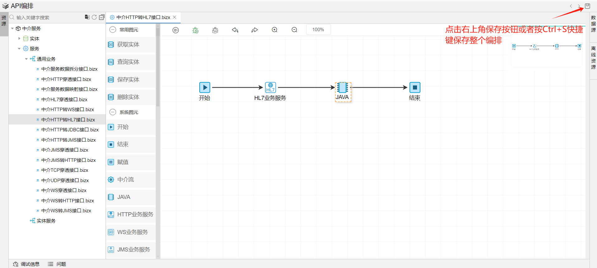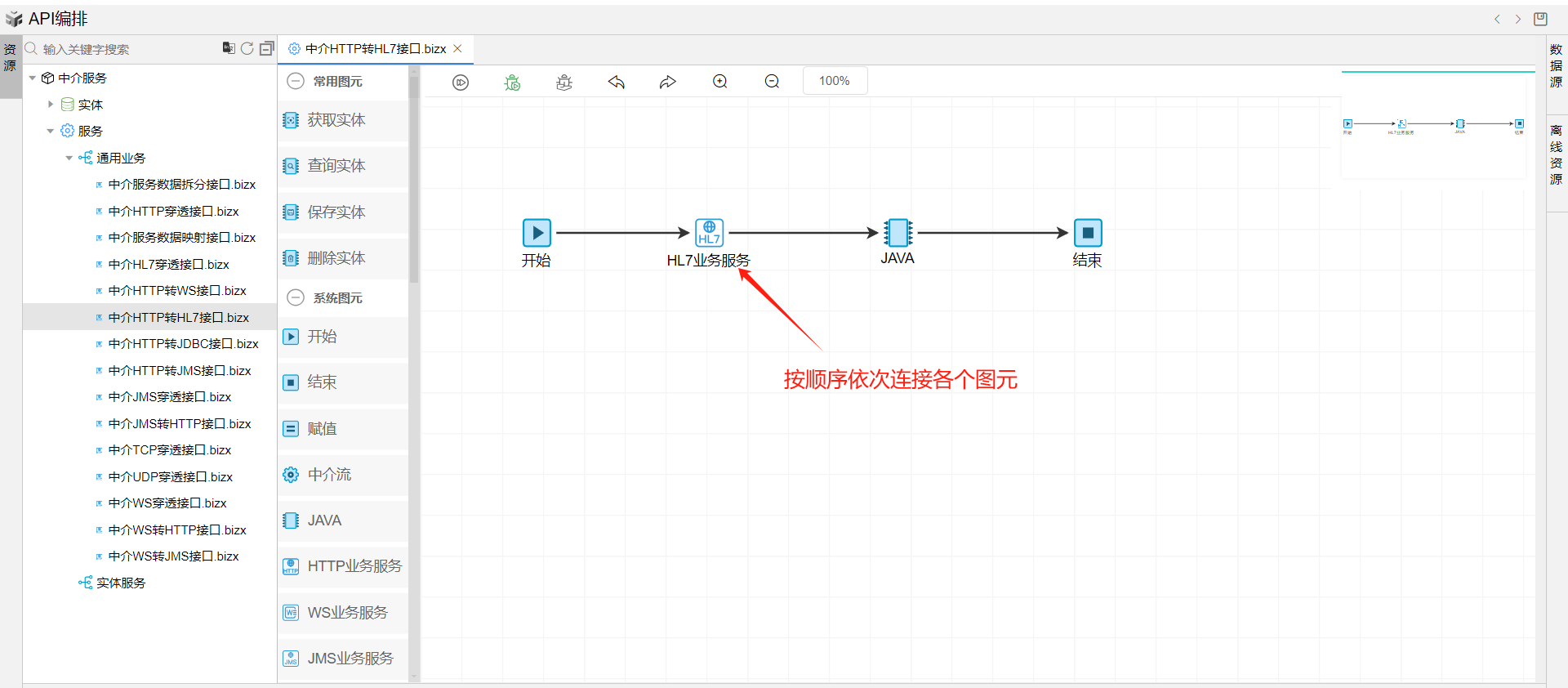 保存成功后系统自动打开中介编排页面。从左侧拖一个HL7业务服务图元和JAVA图元到开始和结束中间,并依次连接各个图元。如下图: