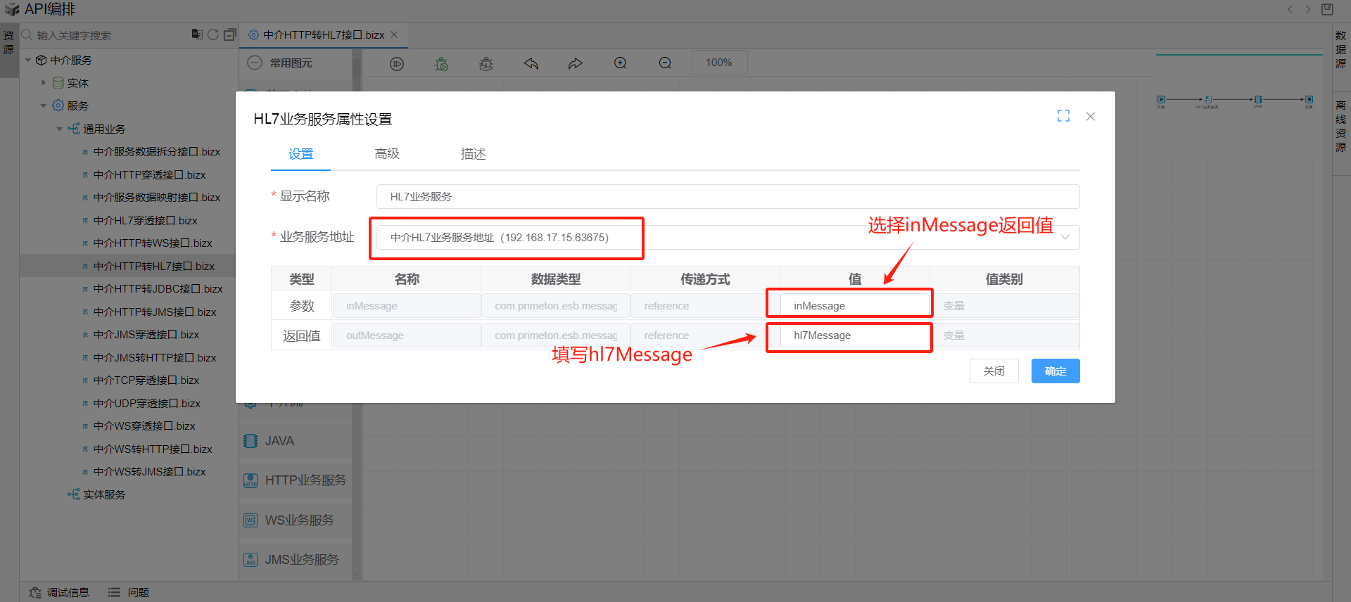 双击打开HL7业务服务图元,选择HL7业务服务地址,参数选择inMessage返回值填写hl7Message。如下图: