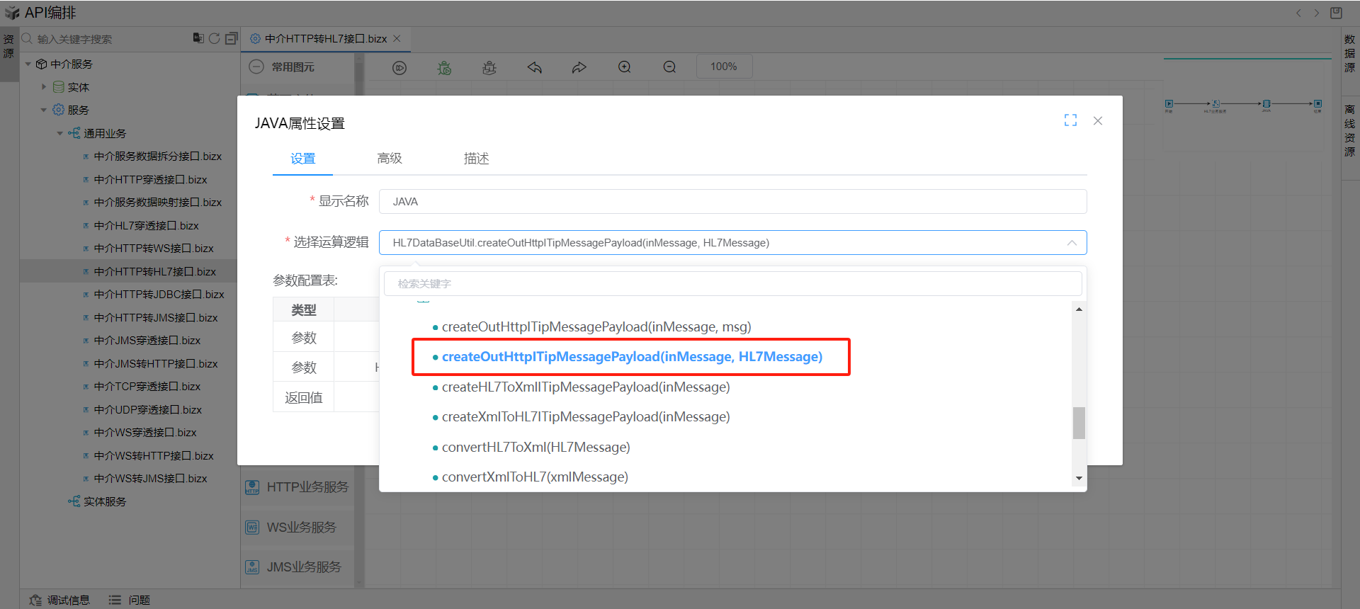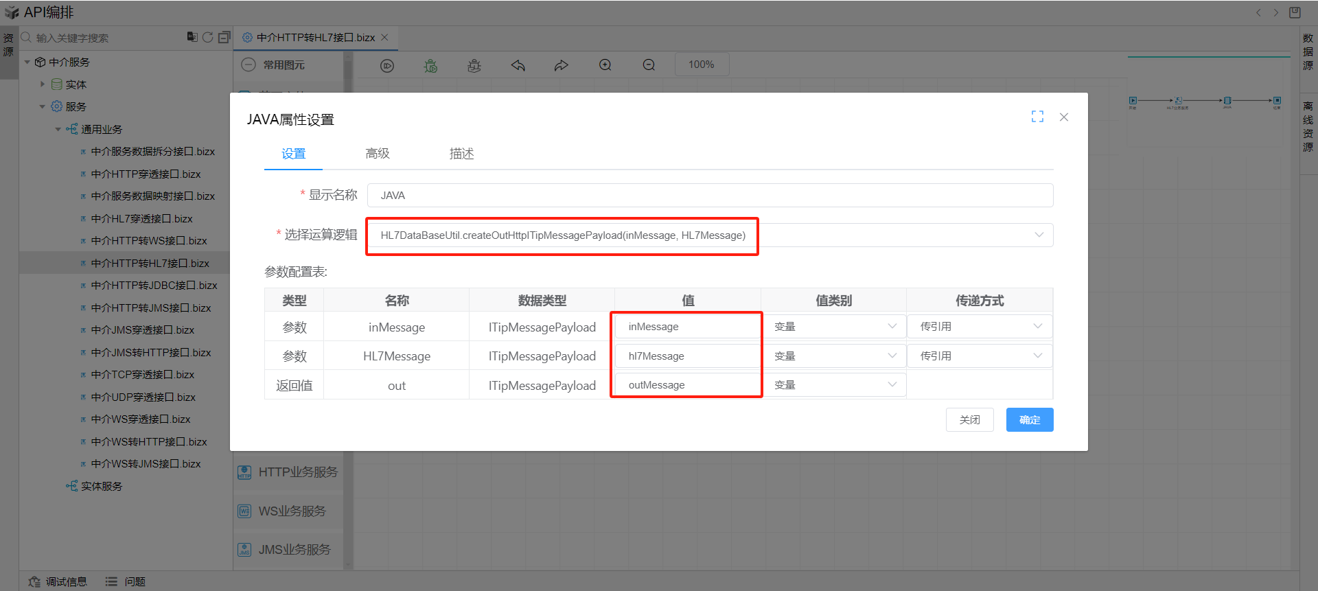 双击打开JAVA图元,选择运算逻辑HL7DataBaseUtil.createOutHttpITipMessagePayload(inMessage, HL7Message)。然后按下图所示填写参数,点击确定。