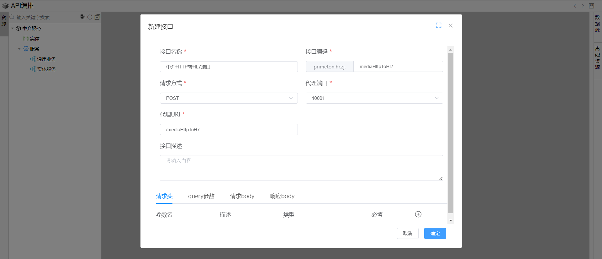 在线编排页面中,在通用业务目录上点击右键,点击新建,点击新建HTTP接口,然后如下图所示填写数据并点击保存确定。