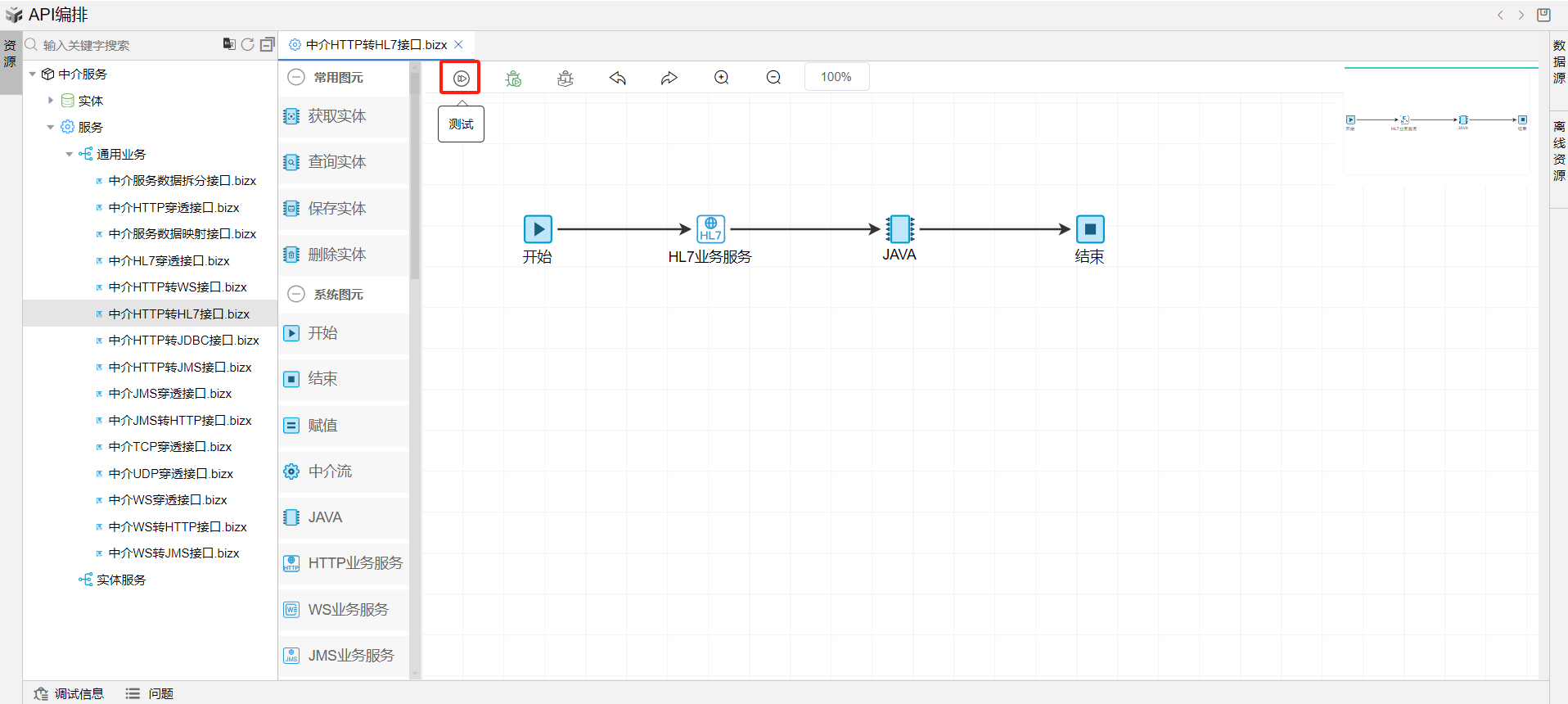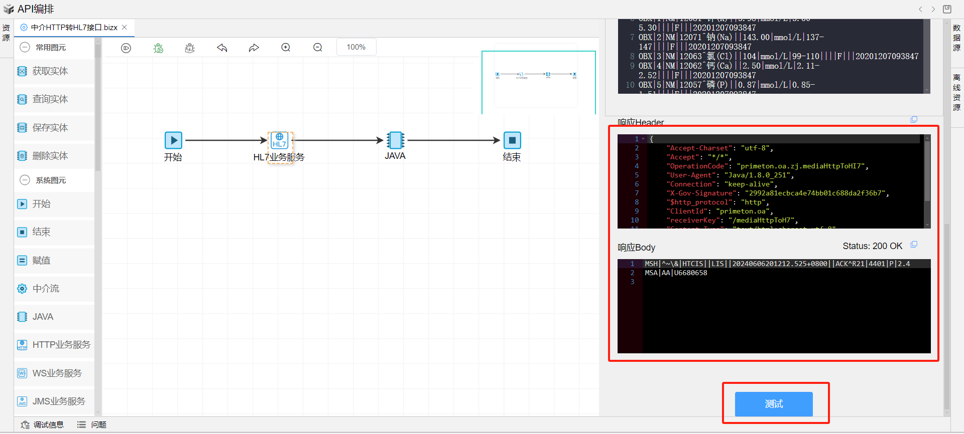 在线编排页面保存成功后,点击界面上方的测试按钮,如下图: