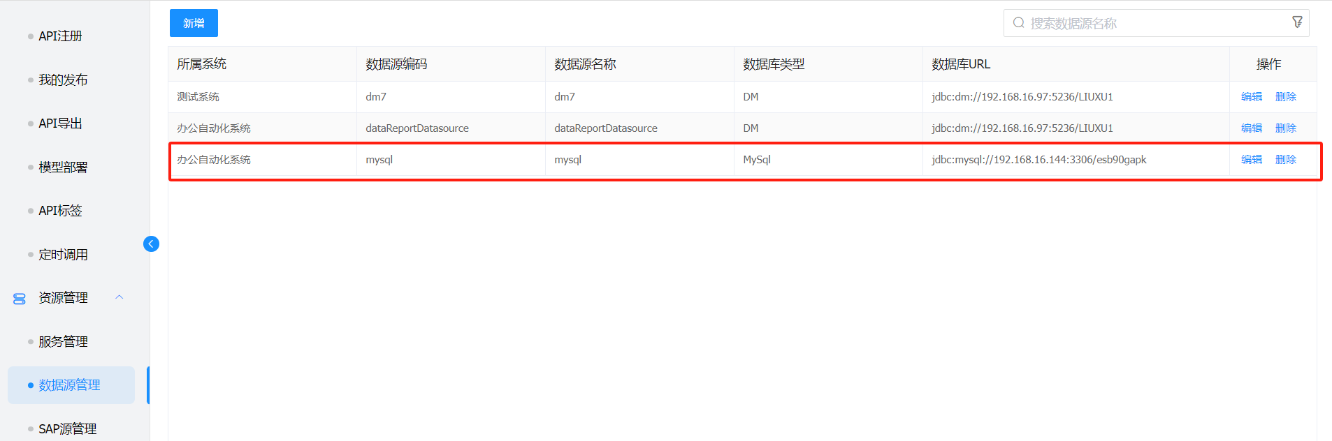 在【资源管理】/【数据源管理】页面新建数据源。(如果已创建过,则请忽略这一步)如下图: