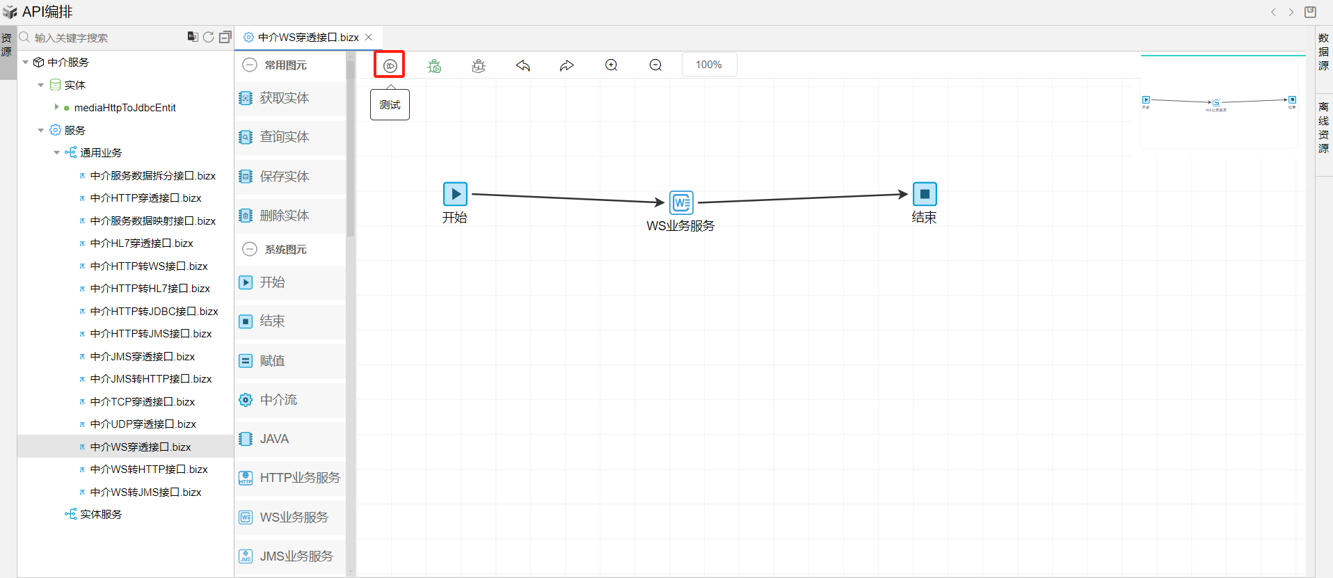 在线编排页面保存成功后,点击界面上方的测试按钮,如下图: