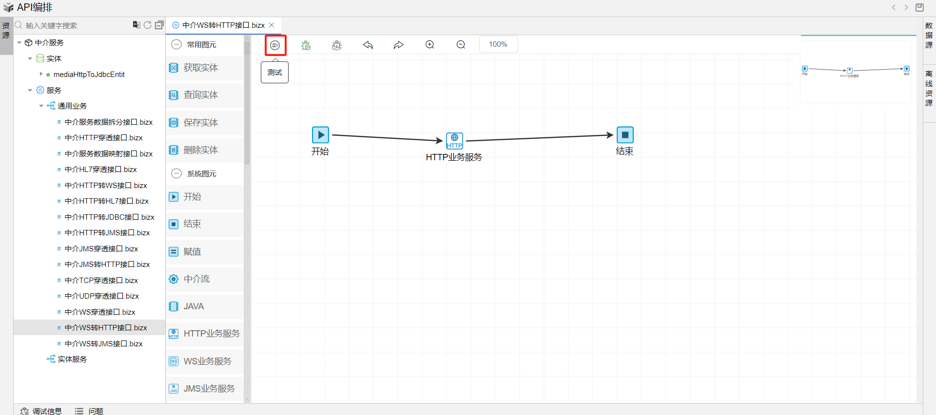 在线编排页面保存成功后,点击界面上方的测试按钮,如下图: