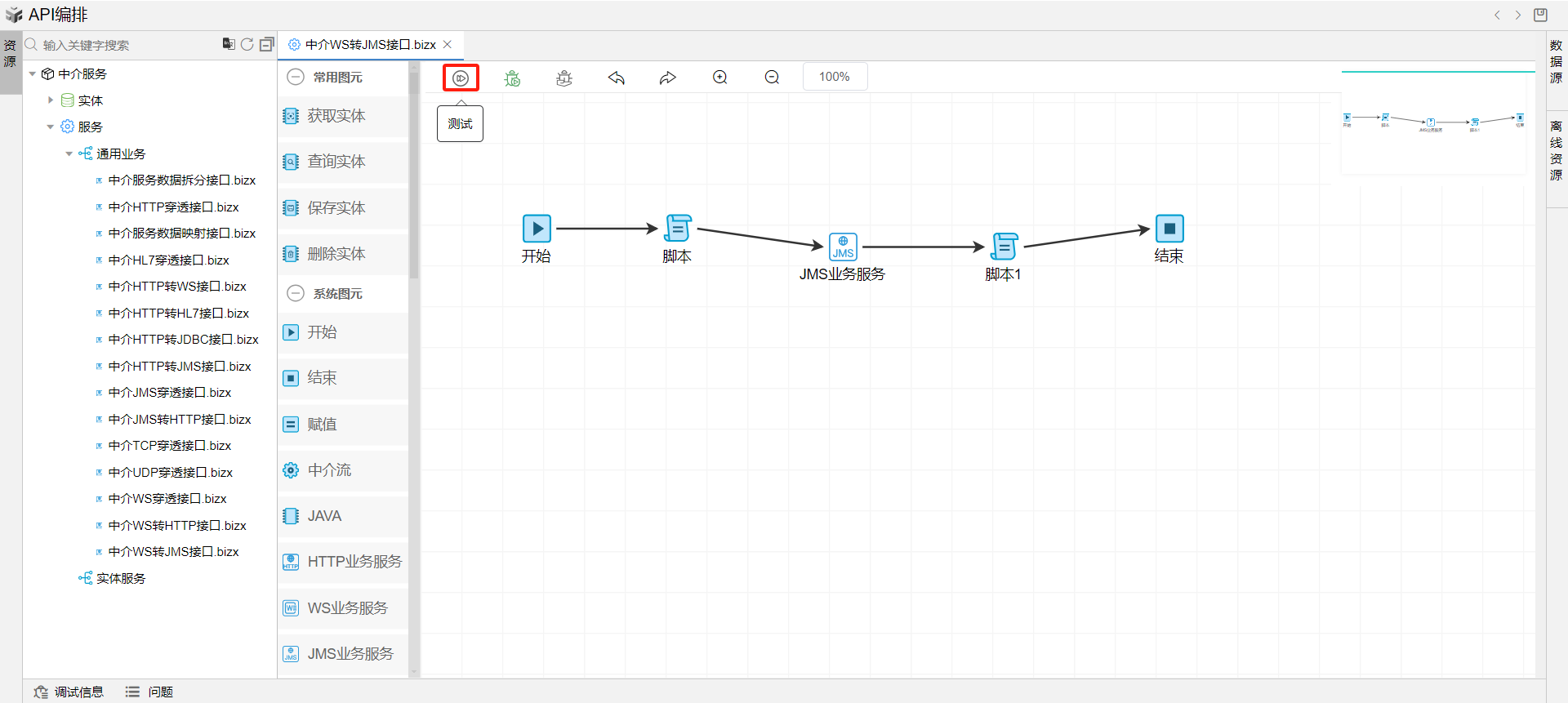 1. 在线编排页面保存成功后,点击界面上方的测试按钮,如下图: