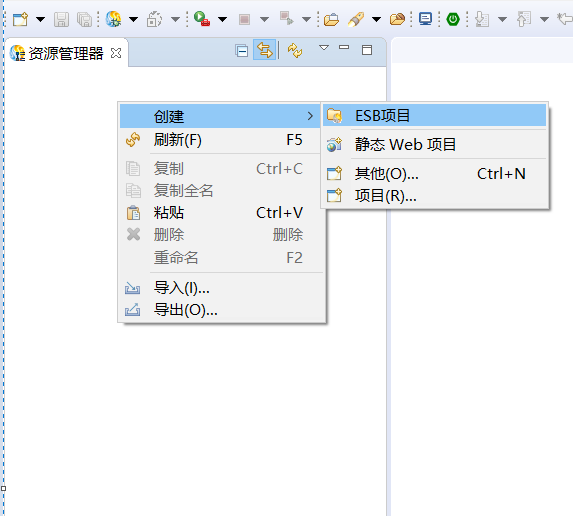 打开ESB Studio,在资源管理器中,点击右键,选择"创建->ESB项目"菜单项,创建ESB项目,如下图所示: