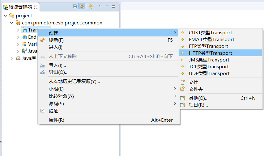 在资源管理器中,右键点击公共Module中"Transport",选择"创建->HTTP类型Transport"菜单项,如下图所示: