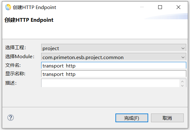 在弹出的"创建HTTP类型Transport"向导中,选择当前的工程、Module,并输入文件名及显示名称,点击"完成"按钮,如下: