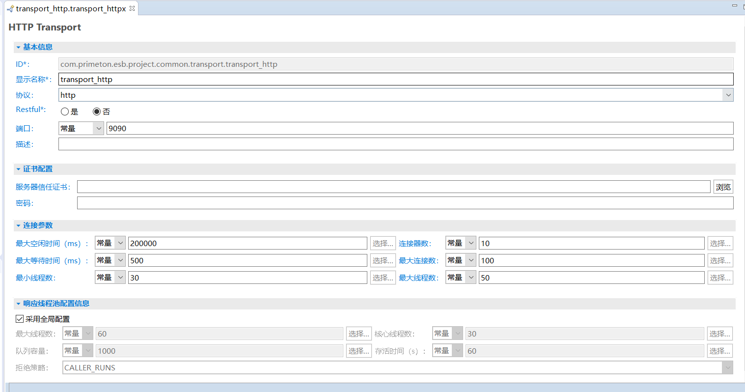 - 文件名:用于存储HTTP Transport配置的文件名。需要保证在ESB工程中唯一。