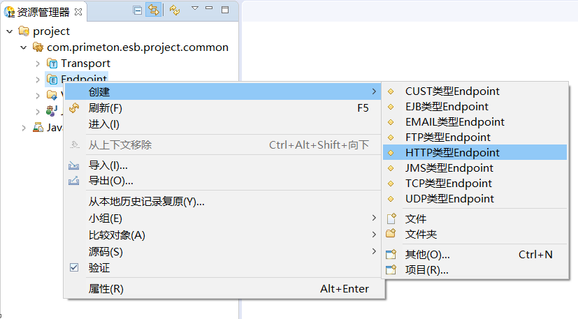 1. 在资源管理器中,右键点击公共Module中"Endpoint",选择"创建->HTTP类型Endpoint"菜单项,如下所示:
