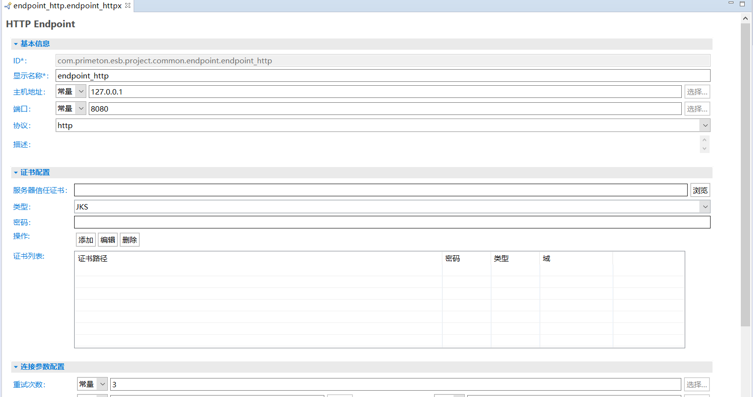 • 文件名:用于存储HTTP Endpoint配置的文件名。需要保证在ESB工程中唯一。