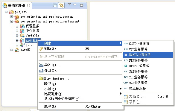 在资源管理器中右键点击业务Module中的"业务服务",选择"创建->EMAIL业务服务" 菜单项。
