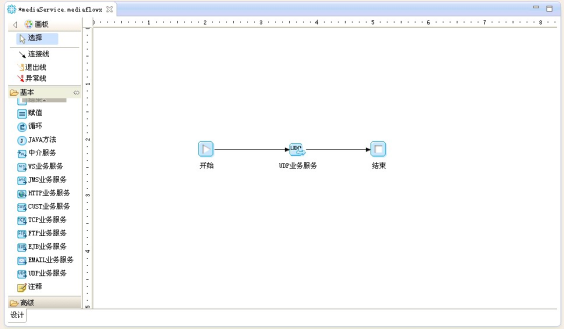 选中UDP业务服务图元将此图元拖拽到编辑区,用连接线依次将开始、UDP业务服务和结束三个图元连接起来,如下图所示: